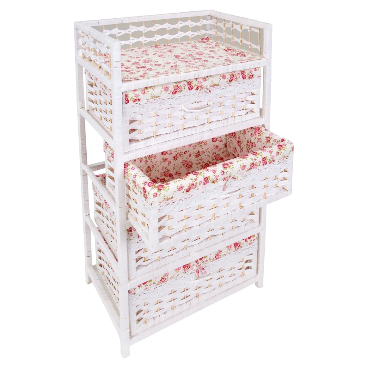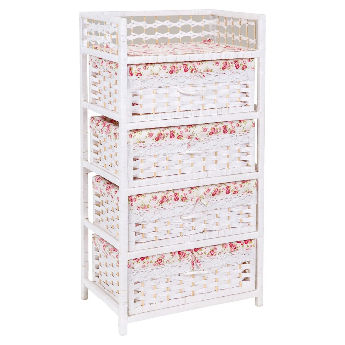 Ein Hauch von Nostalgie und Eleganz, der Ihr Herz höherschlagen lässt! Die Kommode verzaubert mit ihrer modernen Flecht-Optik und den geräumigen Fächern jeden Tag aufs Neue: Das romantische Rosenmotiv schafft eine warme Atmosphäre. Gleichzeitig sorgen zarte Rüschenbänder und hübsche Schleifchen für einen bezaubernden Blickfang.