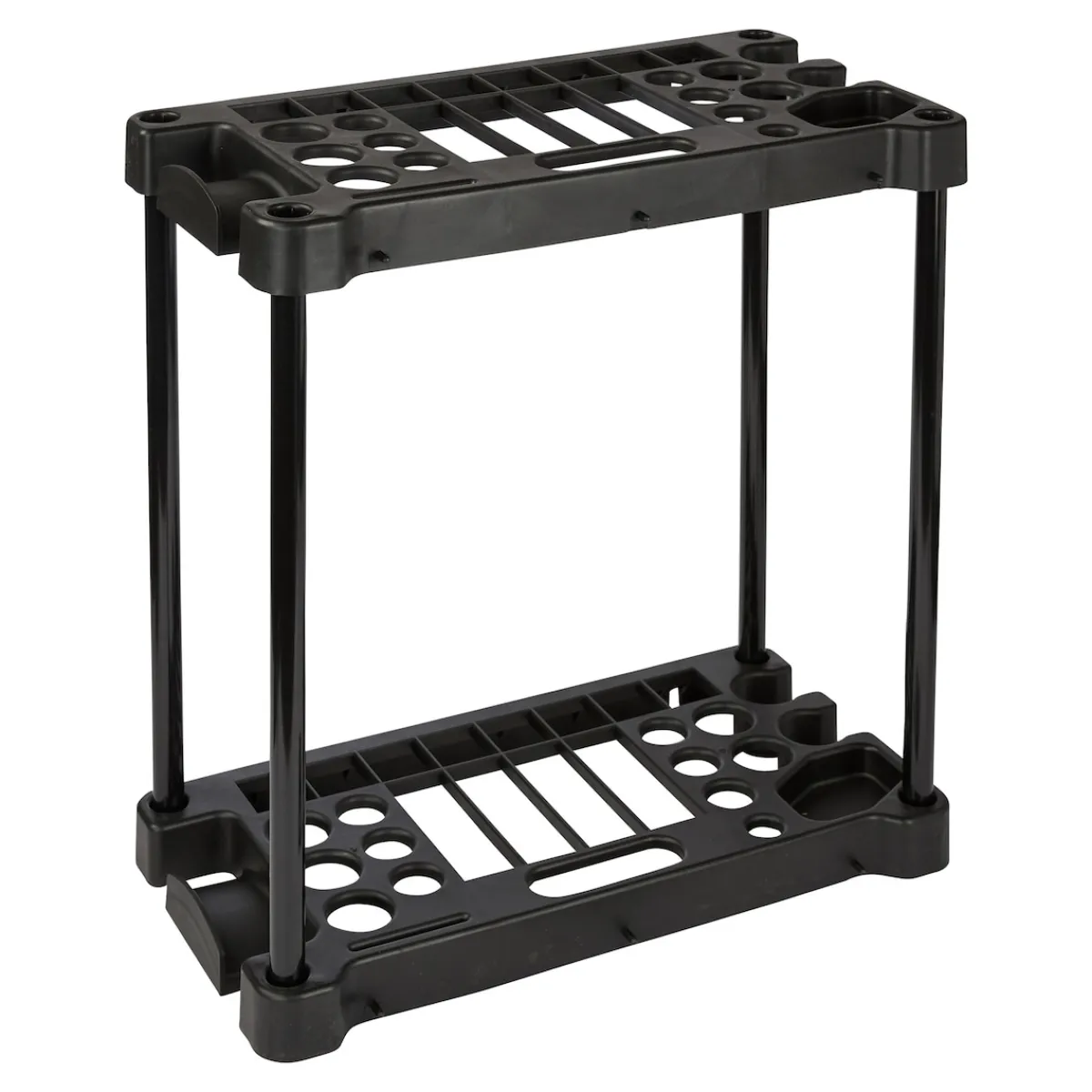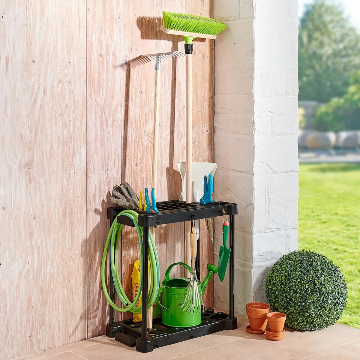 In diesem praktischen Ständer finden Gartengeräte wie Schaufeln, Rechen, Scheren etc. ihren perfekten „Parkplatz“. Mit integrierter Schlauchhalterung und Haken zum Aufhängen von kleineren Geräten.