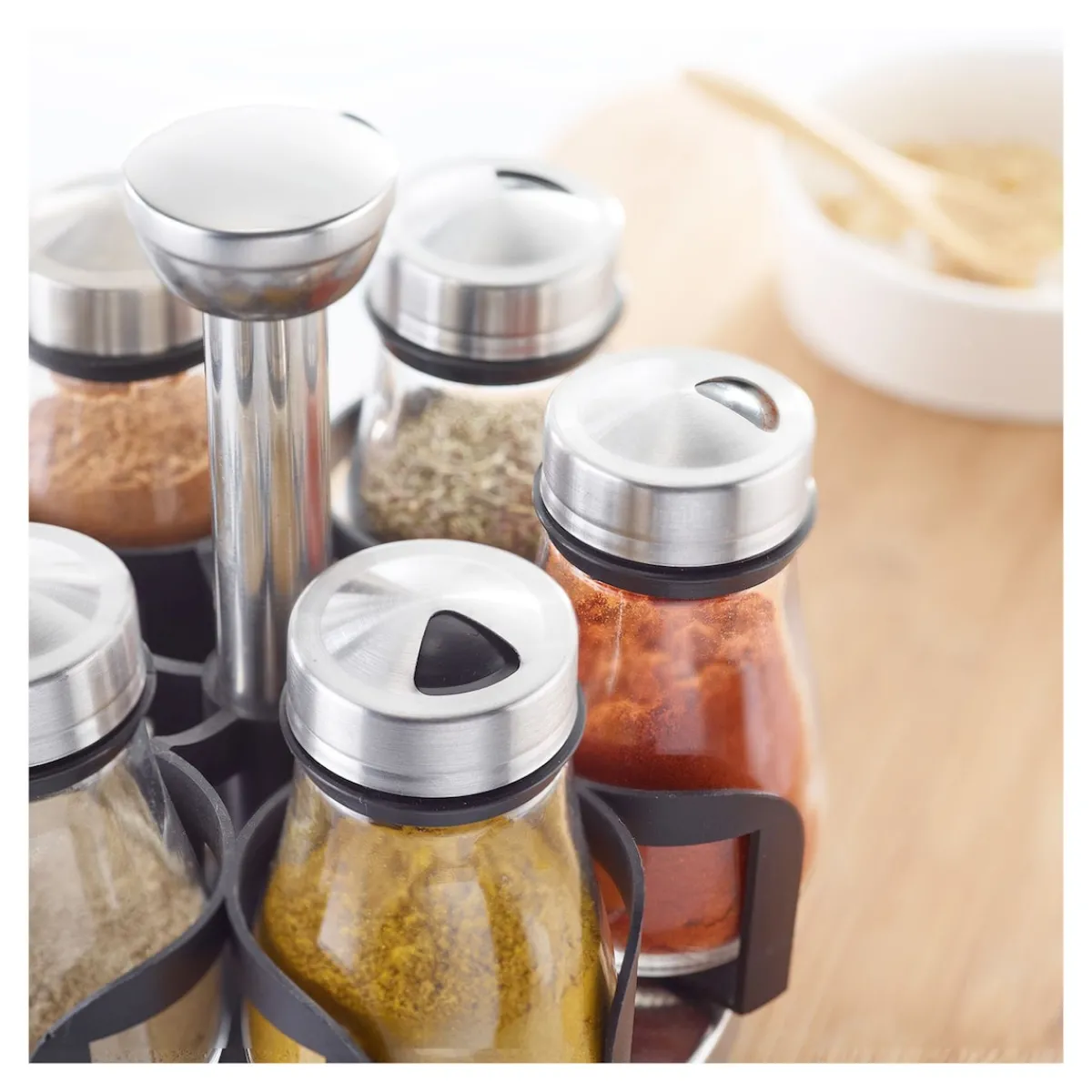 Ob beim Alltagskochen oder beim Dinner mit Freunden – Gewürze sind das i-Tüpfelchen Ihrer Gerichte. Doch wie oft suchen Sie nach Paprika, Curry oder Oregano? Dieses drehbare Rondell mit sechs eleganten Glasbehältern bringt Ordnung in Ihre Küche. Jeder Behälter fasst ca. 125 ml, lässt sich leicht befüllen und reinigen. Ideal für Ihr Zuhause – oder als praktisches Geschenk zur ersten Wohnung.