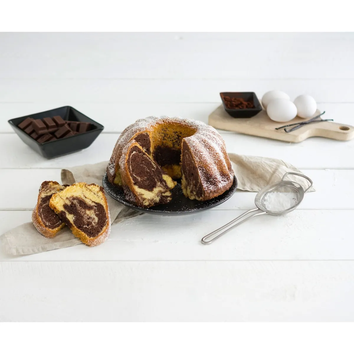 Die schwarze Kuchenform mit Metallic-Effekt überzeugt nicht nur optisch, sondern auch mit sehr guten Backergebnissen, bei einer gleichmäßigen Bräunung. Dabei ist die Backform hitzebeständig bis +230°C. Die schwarze Antihaftbeschichtung ermöglicht das unkomplizierte Lösen des Kuchens aus der Form und sorgt gleichzeitig für eine leichte Reinigung per Hand.