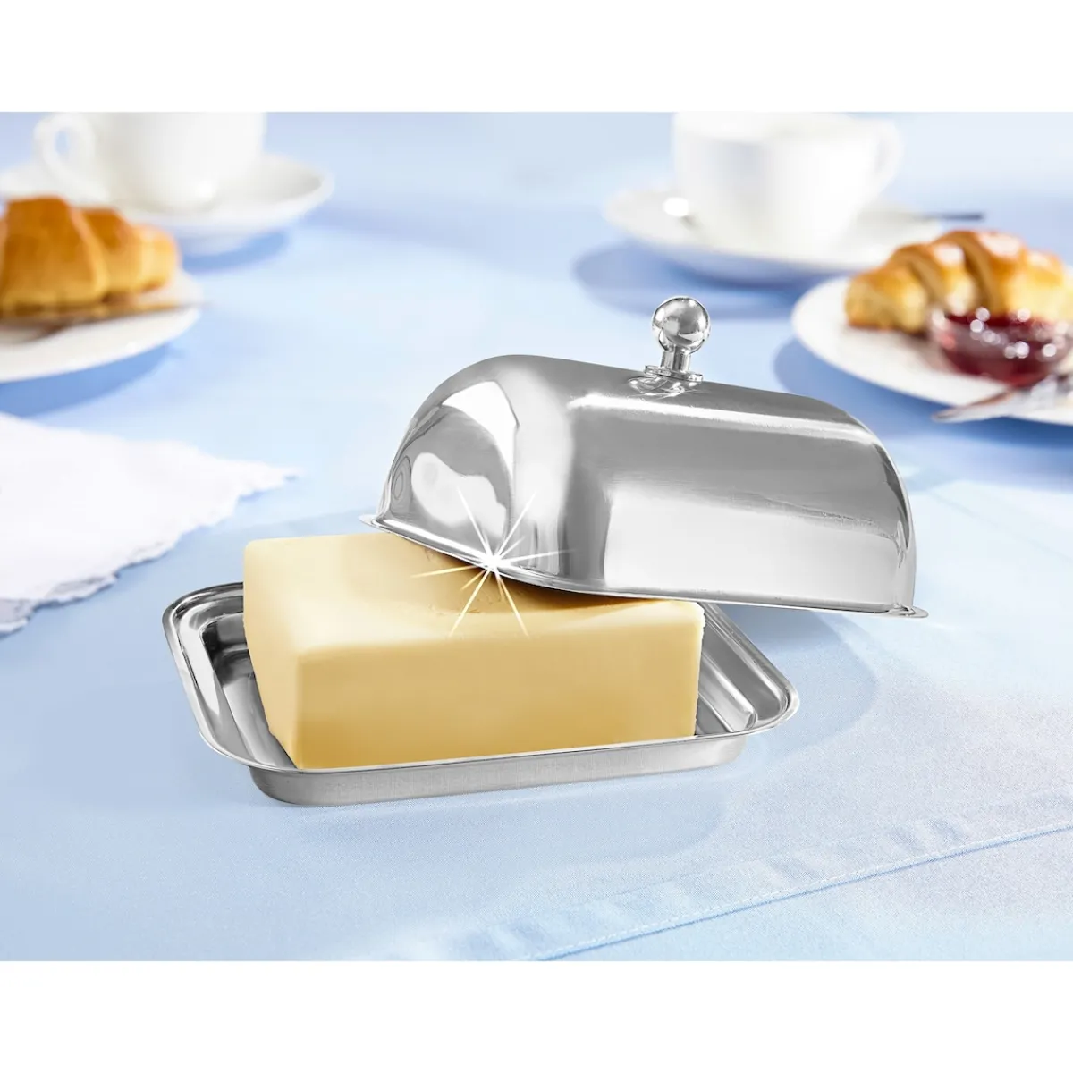 Neben ihrer isolierenden Funktion überzeugt die Butterdose aber auch mit ihrer gelungenen Optik. Denn mit dem hochwertigen Edelstahl macht sie auf jeder Tafel eine gute Figur und sorgt zwischen Brotkorb, Eierbechern und Marmeladengläsern für den einen oder anderen glanzvollen Moment. Ein Hingucker ist die Kugel auf der Haube, die als Griff dient und ein bequemes Öffnen und Schließen der Butterdose ermöglicht. Praktischer Nebeneffekt: Die polierte Oberfläche der Haube muss nicht angefasst werden und bekommt keine störenden Fingerabdrücke. In Sachen Reinigung zeigt sich die Butterdose unkompliziert: Nach dem Gebrauch lässt sie sich wahlweise von Hand spülen oder in die Spülmaschine geben.