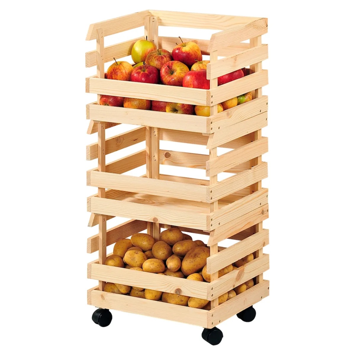 Die vier in alle Richtungen beweglichen Lenkrollen sorgen dafür, dass sich die Horde ohne Kraftanstrengung verschieben lässt. So ist es problemlos möglich, unter und hinter den Kisten zu putzen oder die Horde zur Verarbeitung von Äpfeln oder Kartoffeln in die Küche zu rollen. Tipp: Für maximale Haltbarkeit der Lebensmittel ist es sinnvoll, die Kartoffel- und Obsthorde an einem möglichst dunklen und kühlen Ort aufzustellen. Ideal ist ein unbeheizter, aber trockener Kellerraum.