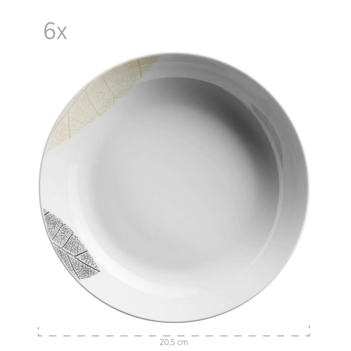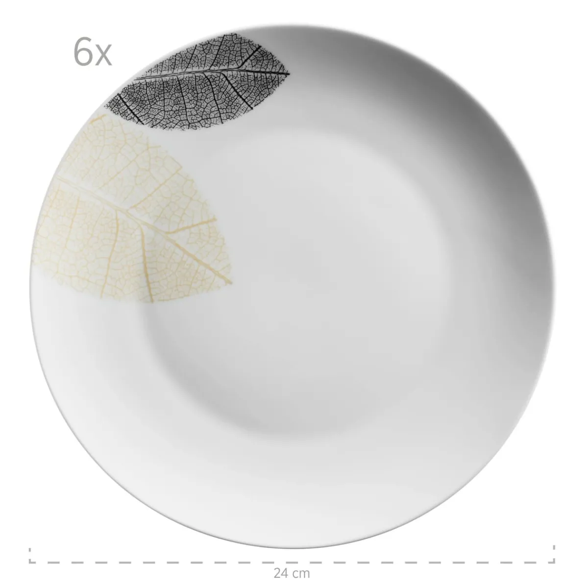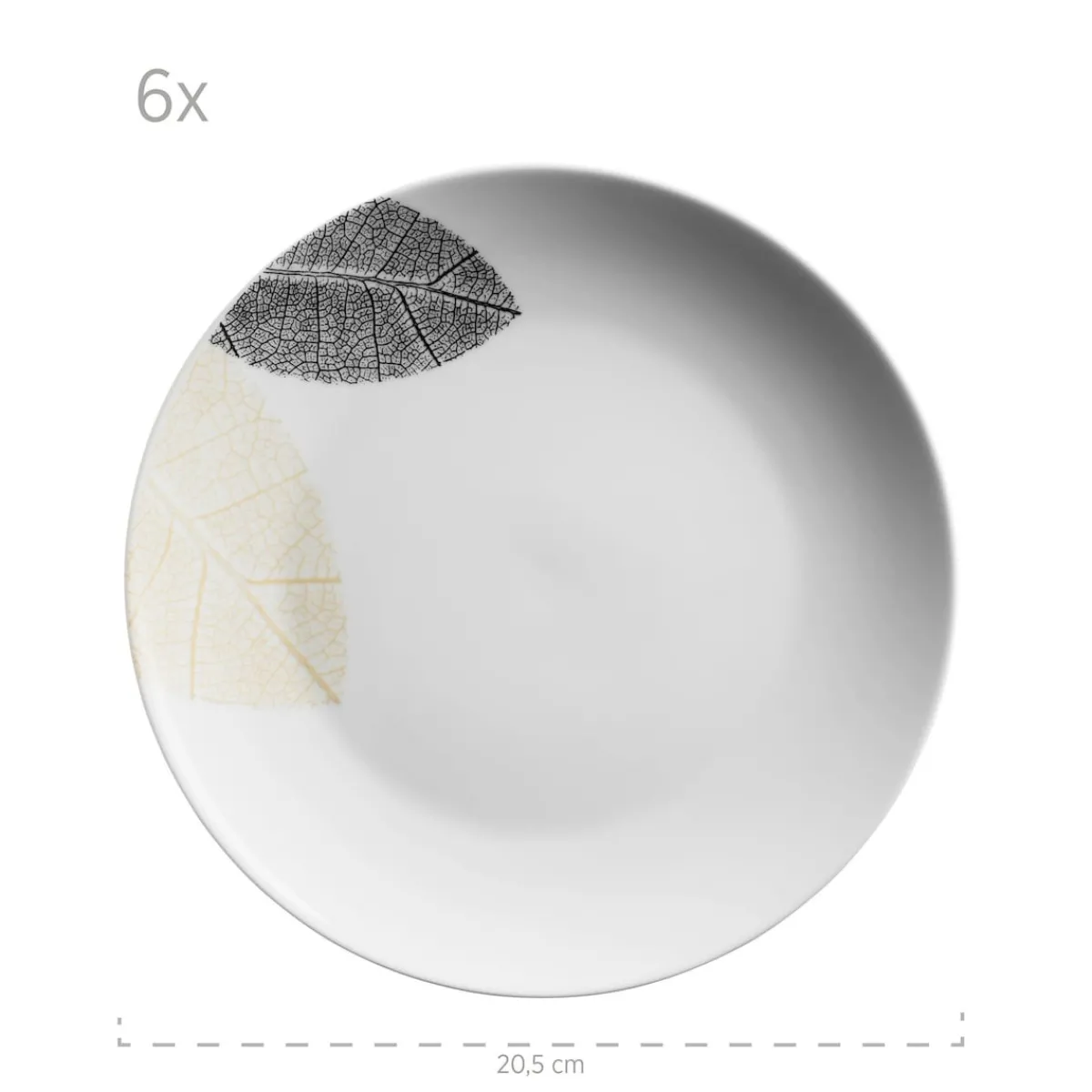 Die Porzellangeschirr-Serie JONAS der österreichischen Traditionsmarke MÄSER präsentiert sich mit einem großflächigen, feingliedrigen Blätterdekor auf modernen randlosen Formen. Verspielt und dennoch elegant, klassisch und zugleich modern – die Schönheit dieser Kollektion ergibt sich aus der Verbindung von traditionellen und topaktuellen Design-Elementen. Dieses Kombiservice für 6 Personen bietet eine Ihnen solide Ausstattung für den Einsatz vom Frühstück über den Nachmittagskaffee bis hin zum dreigängigen Dinner. Alle Teile sind dauerhaft spülmaschinen- und mikrowellengeeignet, und dadurch äußerst pflegeleicht. Die in den Fotos angegebenen Füllmengen beziehen sich aus Gründen der Vergleichbarkeit auf eine Befüllung bis zum oberen Gefäßrand, bei den Abmessungen handelt es sich um Außenmaße.