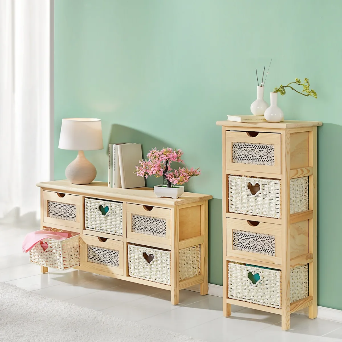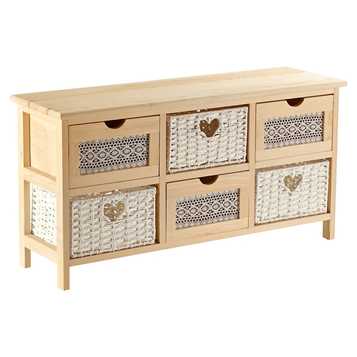 Mit dieser Kommode zieht Romantik in Ihr Zuhause ein! Das praktische wie dekorative Möbelstück überzeugt bis ins letzte Detail: Die stimmige Kombination aus edlem Holzrahmen, Häkelmusterverzierten Schubladenblenden und geflochtenen Korbfächern sorgt für eine charmant natürliche Optik. Ein ganz besonderer Aufbewahrungsort für Dinge, die Ihnen am Herzen liegen. In 3 Größen mit 2, 4 oder 6 Schubfächern. o.g. Artikel wird ohne eine Aufbauanleitung oder eine Gebrauchsanleitung geliefert.