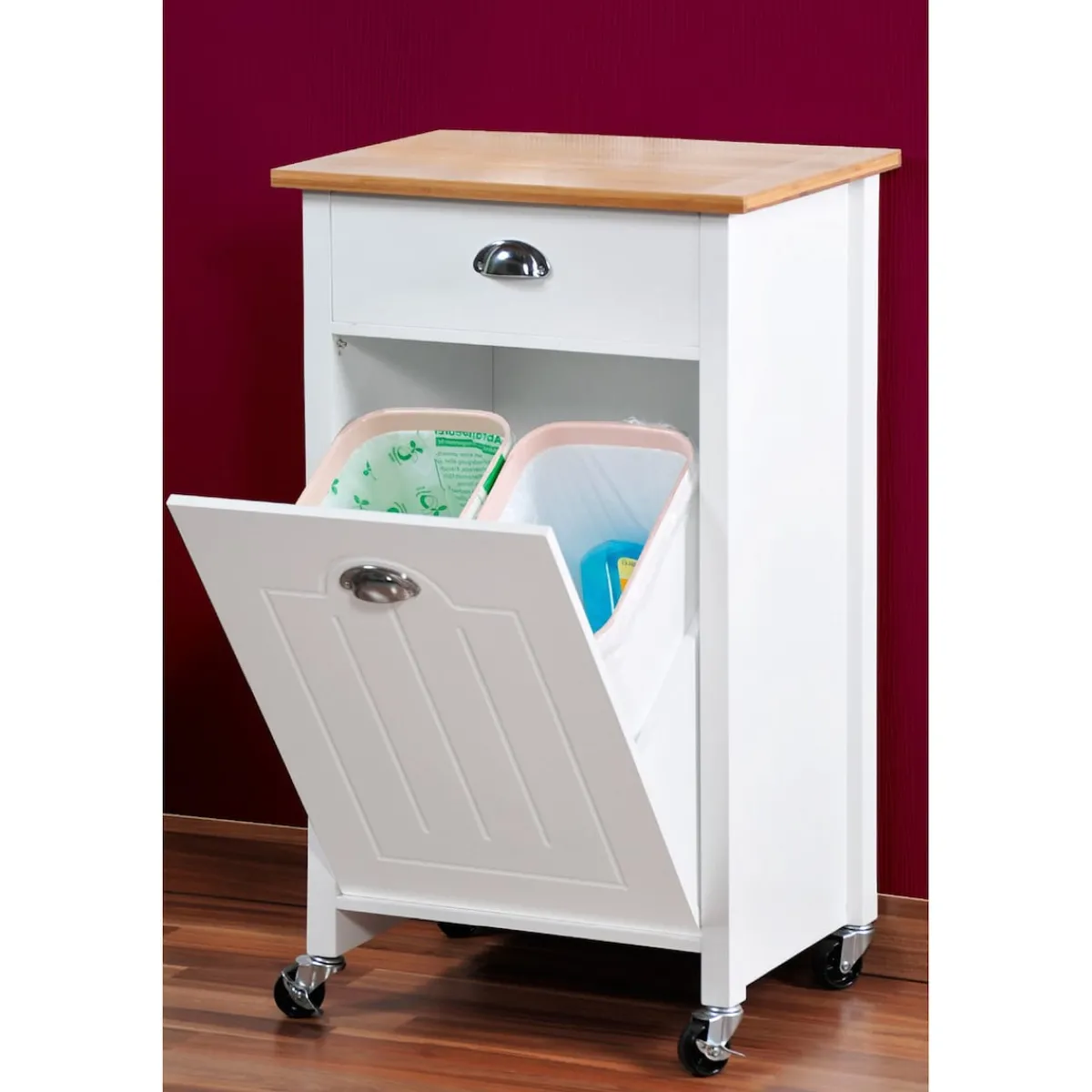 Der moderne Küchenwagen mit Mülltrennsystem schafft zusätzlichen Stauraum in der Küche. Im aufklappbaren Unterschrank befinden sich zwei herausnehmbare Abfalleimer zur Mülltrennung. Die Mülleimer besitzen ein Fassungsvermögen von je 15 Litern und sind mit Mülltütenbefestigungsringen ausgestattet. Über der Klappe ist eine Schublade angebracht, beide sind mit formschönen Metallgriffen versehen. In der zusätzlichen Aufbewahrungsmöglichkeit lassen sich Dinge wie Müllbeutel, Besteck oder andere Küchenaccessoires ordentlich und leicht zugänglich aufbewahren.