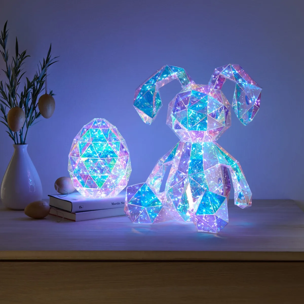 Wow – diese Osterdeko ist echt spektakulär! Im Inneren dieser Figuren erstrahlen viele LED-Lichter und erzeugen zusammen mit dem Facettenschliff einen glänzenden Regenbogeneffekt. Mit USB-Anschluss.