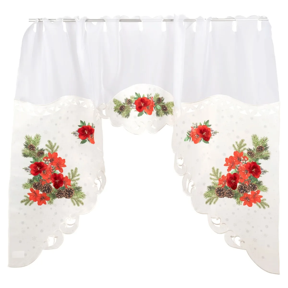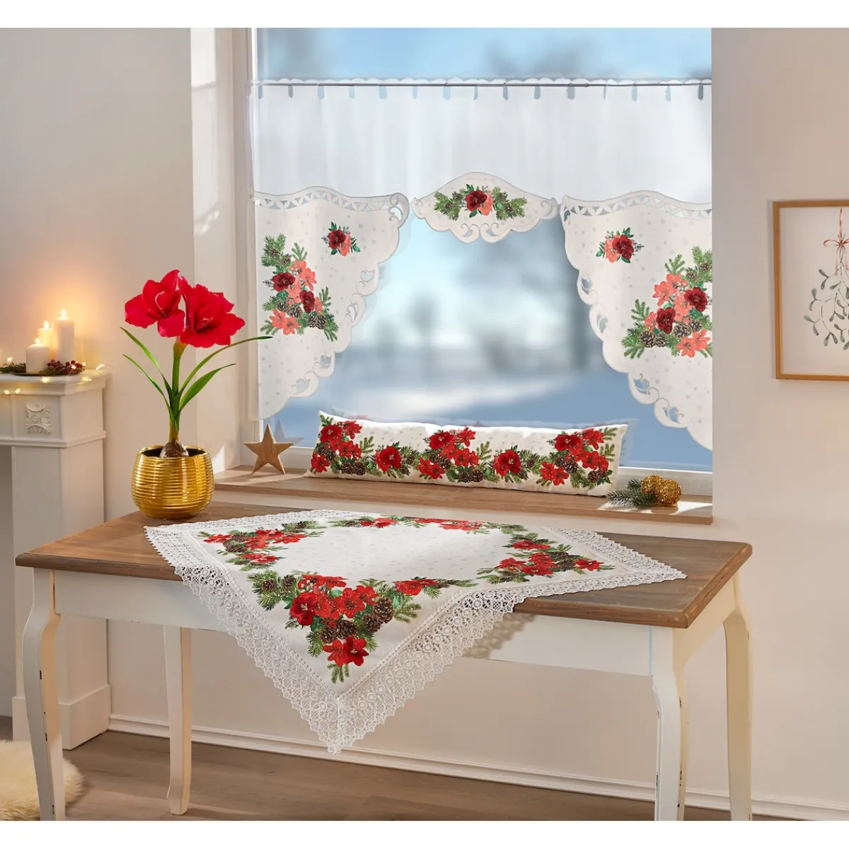 Mit ihren imposanten Blüten ist die Amaryllis ein beliebtes Weihnachtssymbol. Lassen Sie in diesem Sinne auch Ihr Zuhause gebührend weihnachtlich aufblühen: Halb bestickt, halb bedruckt veredelt sie als Bistrogardine das Fenster.