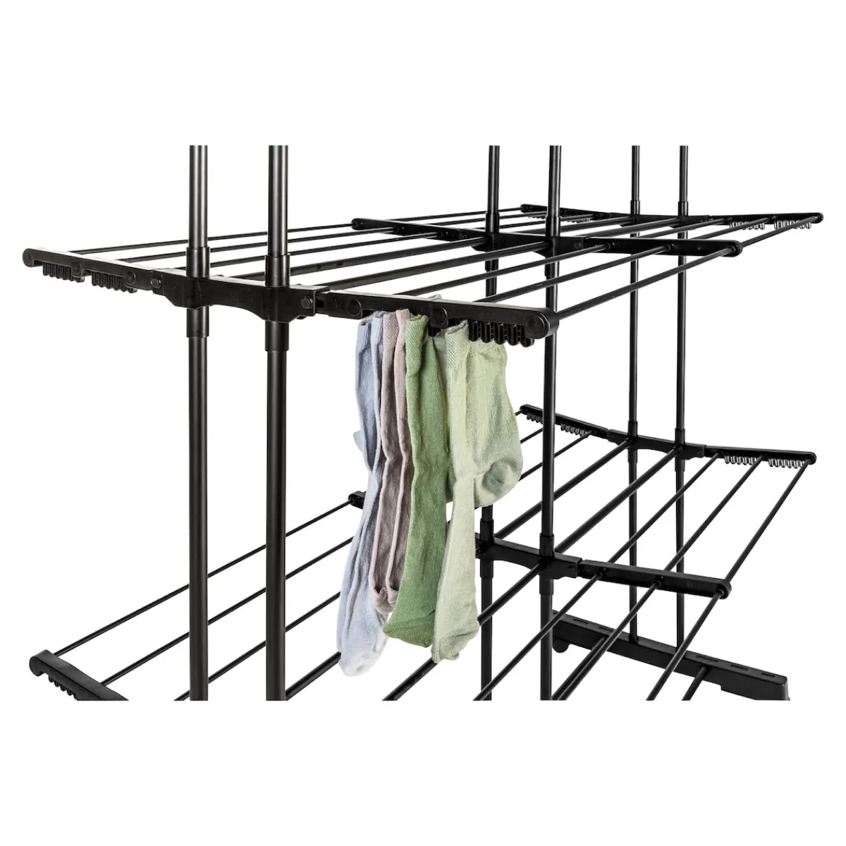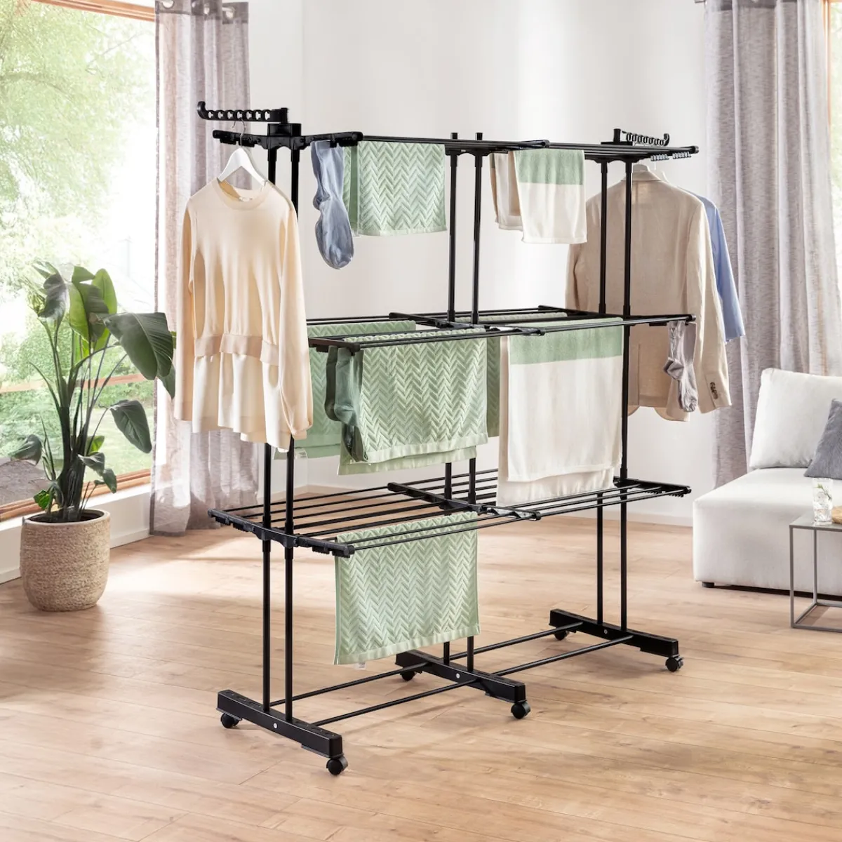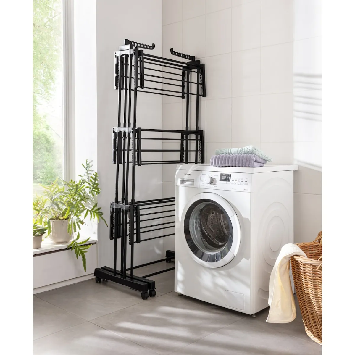 48 Trockenstangen auf 3 Ebenen – so viel Platz bietet kaum ein anderer! Dieser stabile Maxi-Wäscheturm ist bis zu einer Breite von 180 cm ausziehbar und passt sich so immer den Raum- und Wäscheverhältnissen an. Nach Gebrauch im Nu zusammengeklappt und verstaut. Leicht verschiebbar dank Rollen. Trockenfläche: bis zu 40 m.