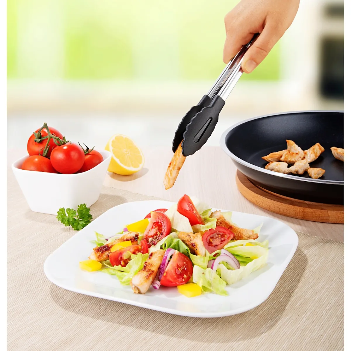 Das Funktionsteil, mit dem Sie die Lebensmittel greifen, besteht aus einem besonderen Kunststoff. Diesen können Sie auch in beschichteten Töpfen und Pfannen verwenden, ohne dass die Zange dort unschöne Kratzer hinterlässt. Das Material ist äußerst hitzebeständig, es hält problemlos Temperaturen von bis zu 180 °C aus.