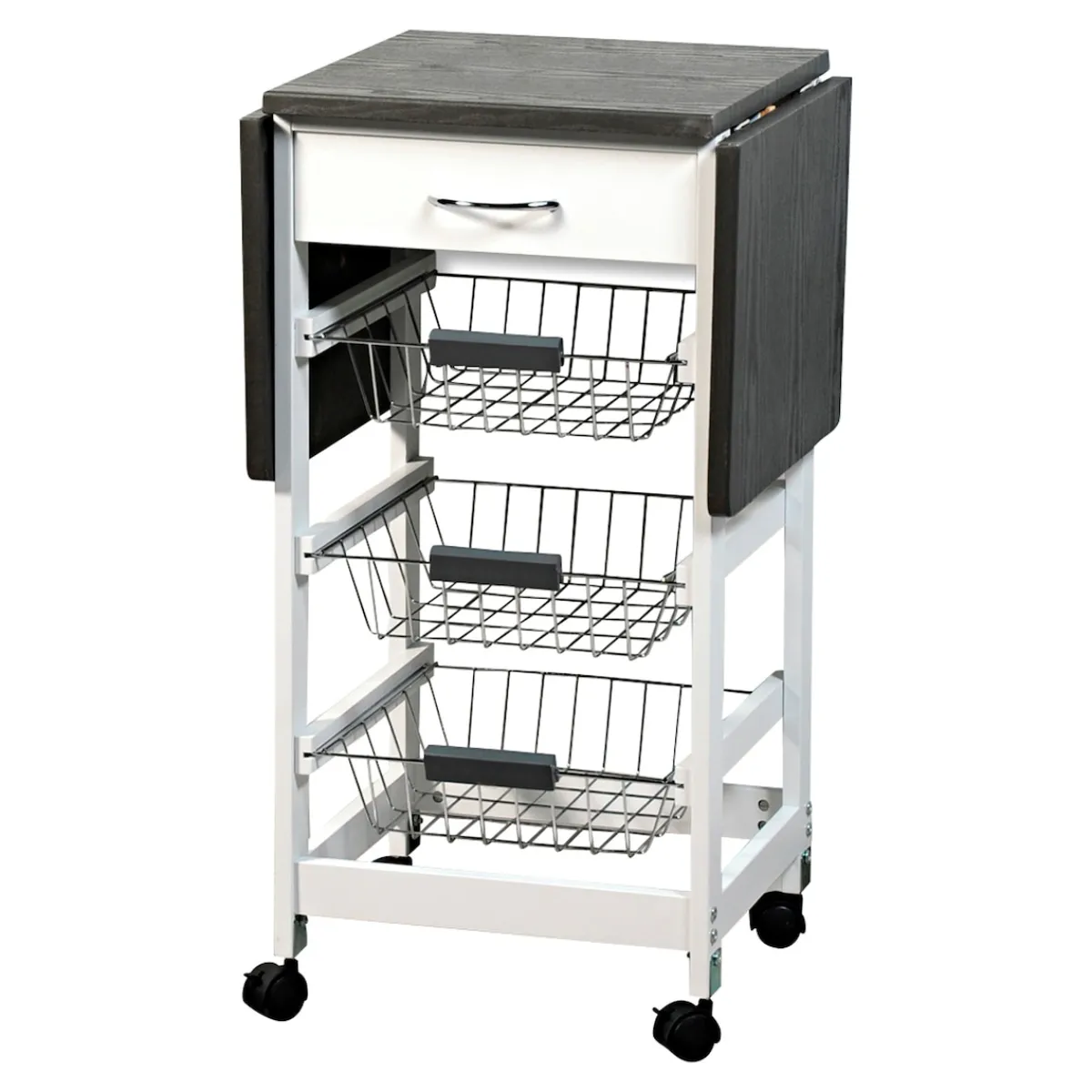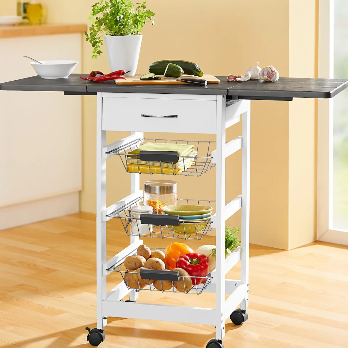 Zu wenig Platz in der Küche – kein Problem: Der Multi-Küchenwagen schafft hier schnell und einfach Abhilfe! Dank seiner 2 ausklapp baren Tischplatten können Sie Ihre Arbeitsfläche im Handumdrehen erweitern, und 3 Schubkörbe und die Schublade bieten reichlich Stauraum für all Ihre Küchen-Utensilien. Durch die 4 leichtgängigen Rollen (2 davon feststellbar) lässt er sich bei Bedarf ganz bequem beiseite schieben. Platzsparend zusammenklapp- und verstaubar.