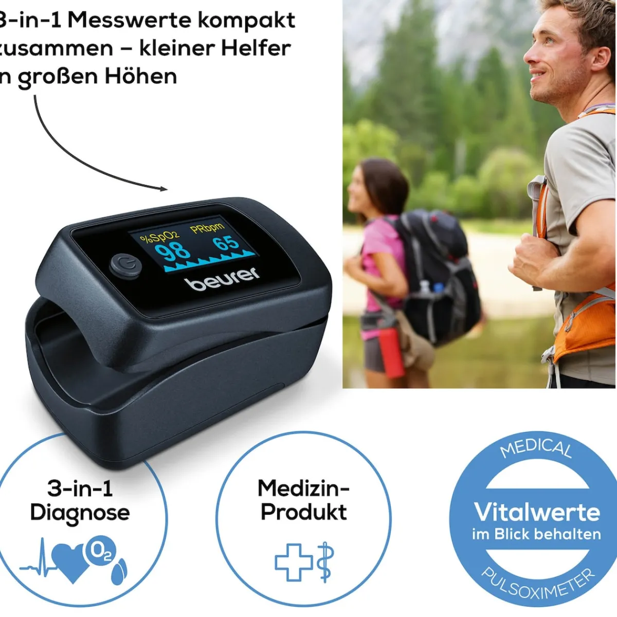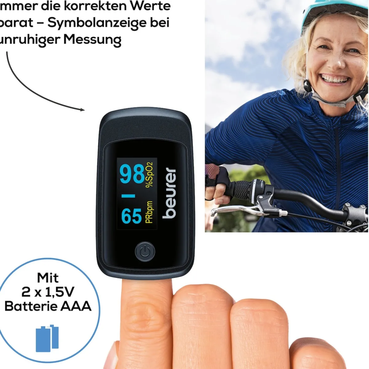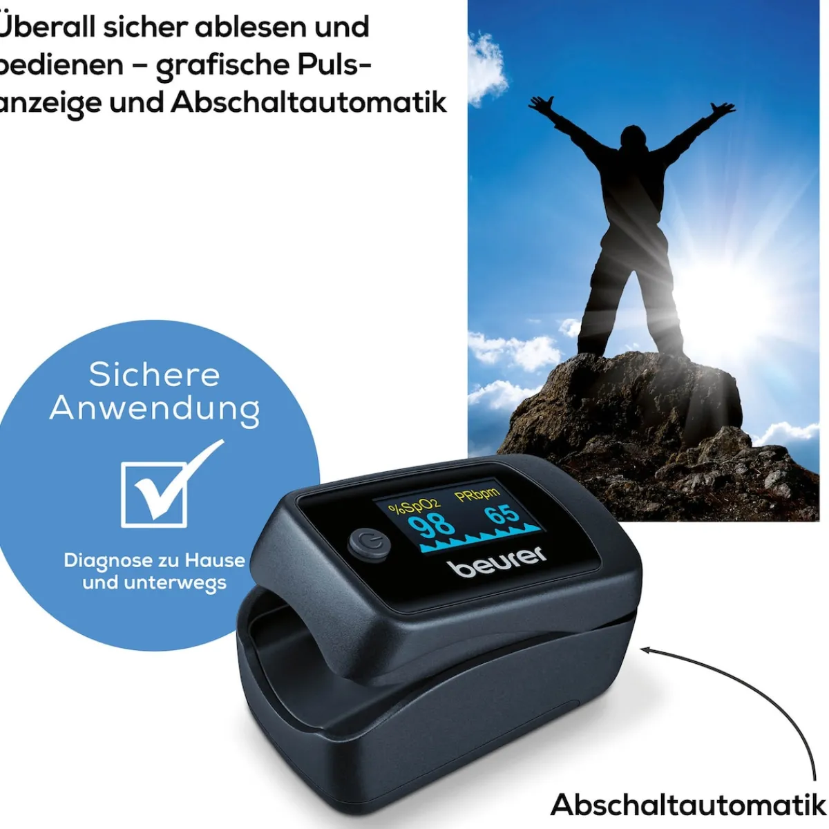 Das kompakte Beurer Pulsoximeter PO 45 ermöglicht die einfache und schmerzfreie Kontrolle der arteriellen Sauerstoffsättigung (SpO₂), der Pulsfrequenz sowie des Perfusionsindex – ganz ohne medizinisches Vorwissen. Die Messwerte erscheinen in Sekundenschnelle auf einem übersichtlichen Farbdisplay, das in sieben Anzeigeformaten eingestellt werden kann. Bei unruhiger Handhabung gibt eine Symbolanzeige hilfreiche Rückmeldung, um die Messung gezielt zu wiederholen. Dank seines geringen Gewichts ist es sowohl zu Hause als auch unterwegs komfortabel einsetzbar – besonders für Menschen mit Atemwegserkrankungen oder für sportliche Aktivitäten in großen Höhen geeignet. Funktionen wie eine graphische Pulsanzeige, einstellbare Helligkeit, Batteriestandsanzeige und eine automatische Abschaltung runden das Gerät ab. Eine praktische Tasche sowie ein Halteband sind im Lieferumfang enthalten. Ideal für den Alltag – egal ob zu Hause auf dem Sofa, bei der Arbeit, beim Spaziergang im Park oder unterwegs auf Reisen.