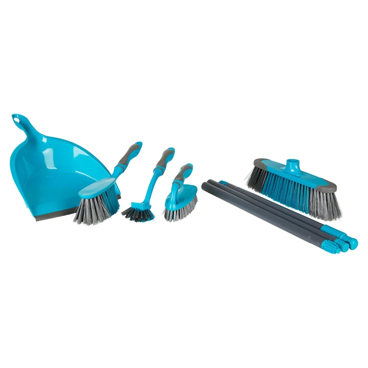 Mit diesem praktischen Marken-Reinigungsset inklusive langem Besen, Kehrschaufel mit Handbesen, Handbürste und Spülbürste ist Ihr Haushalt im Nu wieder sauber.
