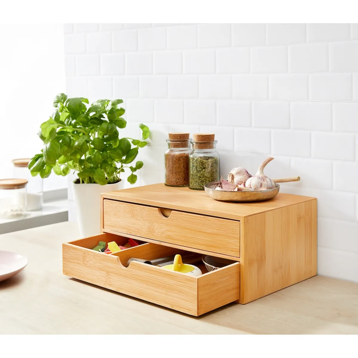 Schlicht, schön, mit einem natürlichen Design – und besonders nützlich dank der beiden tiefen, geräumigen Schubladen: das Schränkchen aus echtem Bambus überzeugt auf ganzer Linie. Mit seiner dezenten Optik passt es natürlich auch in alle anderen Wohn- und Arbeitsräume! Die Einsatzmöglichkeiten des Schubladen-Schränkchens sind wirklich fast unendlich.