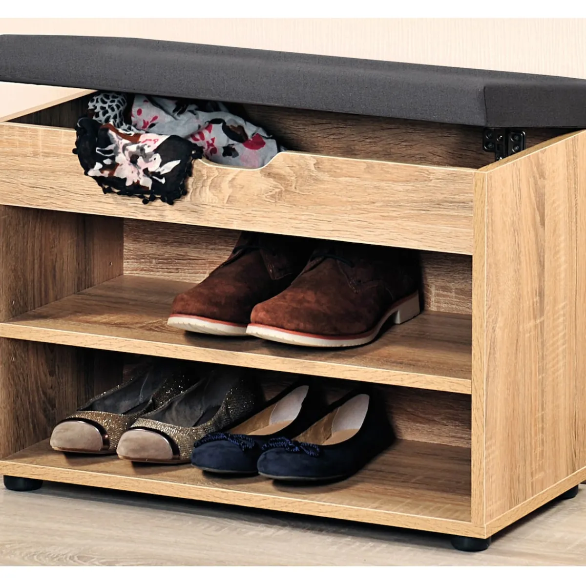 Das bequeme Sitzkissen ist ideal zum Anziehen der Schuhe ohne lästiges Bücken geeignet. Das ist besonders dann hilfreich, wenn es sich um Schuhe mit Schnürsenkeln handelt. Unter der aufklappbaren Sitzfläche befindet sich ein praktisches Fach zum Verstauen von kleinen Gegenständen. Von Handschuhen über Schals und Mützen bis zum kleinen Regenschirm oder Schuhputzzeug findet hier alles Platz, was in der Garderobe benötigt wird. Dabei lässt sich dieses kleine Multitalent auch anderweitig nutzen, zum Beispiel in der Küche oder im Kinderzimmer. Die beiden Fächer dienen dann als praktisches Regal mit bequemer Sitzfläche. Das schlichte, moderne Design des Schuhschranks mit Sitzkissen passt zu jedem Einrichtungsstil und verleiht dem Raum ein gemütliches Flair.