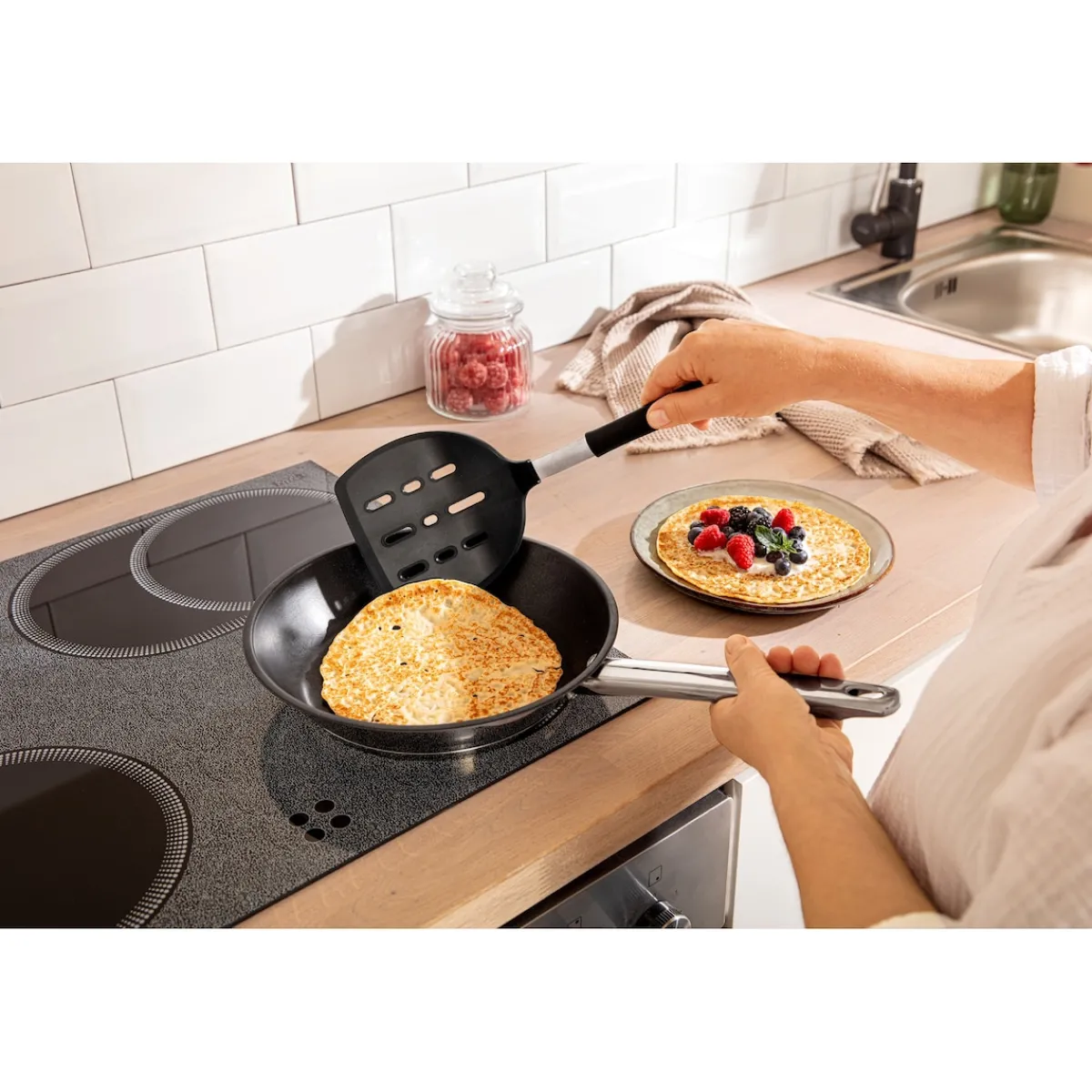Der extra große Pfannenwender eignet sich perfekt zum Umdrehen von Pfannkuchen, Fisch, Omelettes, Wok-Pfannengerichten oder Grillgut. Der Clou: Ihre