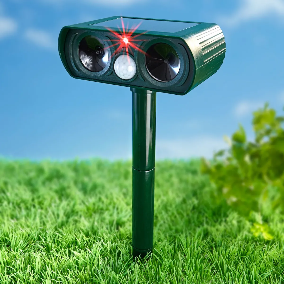 Hilft tierisch gut gegen vierbeinige Streuner! Mit diesem Wächter halten Sie unerwünschte Besucher wie Hunde, Katzen oder andere Tiere aus Ihrem Garten fern. Das Gerät sendet dank Bewegungsmelder ein Ultraschall-Signal mit wechselnden Frequenzen zwischen 25 und 62 kHz aus, sobald ein Tier den Sensor-Bereich betritt. Die Ultraschall-Töne sind für den Menschen nicht hörbar. Befestigung mittels Erdspieß oder zur Montage an der Wand.