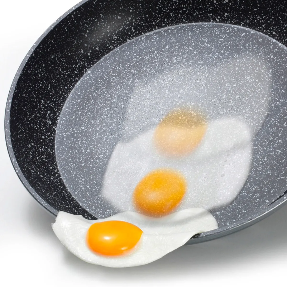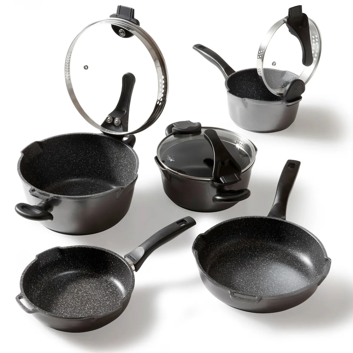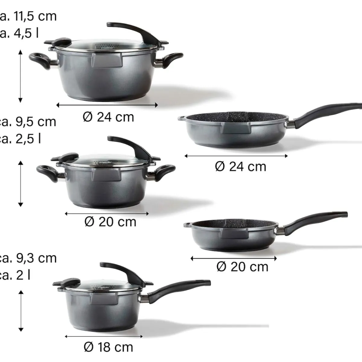 STONELINE – Das Original!Gesund fettfrei kochen und braten! Die STONELINE FUTURE Serie ist sowohl für Rechts- und als auch für Linkshänder geeignet! Zwei praktische Ausgüsse an Töpfen und Pfannen erleichtern das saubere Abschütten und Umfüllen von Flüssigkeiten – ohne Geschirr und Herd zu verschmutzen! Ein weiterer Vorteil der FUTURE Serie von STONELINE ist die integrierte Fein- und Grob-Siebfunktion in den Deckeln.Somit benötigen Sie zukünftig keinerlei Sieb und Schüssel, denn Sie können schnell und einfach beispielsweise die Pasta im Topf servieren. Der Deckel kann handlich in die praktische Deckelhalterung am Kochgeschirr-Rand der Töpfe und Pfannen dieser Serie gestellt werden. Dadurch fließt überschüssige Flüssigkeit einfach wieder zurück ins Kochgeschirr. So vermeiden Sie unnötige Soßen- oder Wassertropfen auf der Arbeitsfläche beim Abnehmen der Deckel. Der speziell entwickelte Deckelknauf bietet viel Platz und ein angenehmes Greifen ohne sich zu verbrennen! Für jeden Anlass das passende Kochgeschirr zur Hand – damit erleichtern Sie sich das Leben in der Küche und sorgen für ein unbegrenztes Kochvergnügen. Dieses 8-teilige Set besteht aus: 1 Bratentopf, ø ca. 24 cm, Höhe: ca. 11,5 cm, ca. 4,5 l1 Kochtopf, ø ca. 20 cm, Höhe: ca. 9,5 cm, ca. 2,5 l1 Stielkasserolle, ø ca. 18 cm, Höhe: ca. 9,3 cm, ca. 2,0 l1 Schmorpfanne, ø ca. 24 cm, Höhe: ca. 6,0 cm, ca. 2,2 l1 Bratpfanne, ø ca. 20 cm, Höhe: ca. 5,5 cm, ca. 1,5 l1 Sieb-Glasdeckel, ø ca. 24 cm1 Sieb-Glasdeckel, ø ca. 20 cm1 Sieb-Glasdeckel, ø ca. 18 cm Die wichtigsten Vorteile des STONELINE Kochgeschirrs auf einen Blick: Kratzfeste STONELINE-Antihaftbeschichtung Vitaminschonend kochen und braten ohne Fett und Ol Optimales Bratergebnis und kross gebratenes Fleisch Auch für Vegetarier geeignet: Gemüse bleibt knackig und saftig Kein Anbrennen und kein Ankleben Super leicht zu reinigen Extra starker, verziehfreier Boden Bodenstärke: 4,5 mm Für alle Herdarten geeignet, auch Induktion Backofengeeignet bis 180 °C Material: Aluminiumguss Reinigungs- und Pflegetipps: Vor dem ersten Gebrauch empfehlen wir, Ihr Koch- oder Backgeschirr mit etwas Wasser und einem milden Spülmittel gründlich auszuwaschen.Verteilen Sie anschließend mit einem Papierküchentuch einige Tropfen Speiseöl auf der Beschichtung.Bei der weiteren Nutzung können Sie auf den Einsatz von Fett oder Ol verzichten!Dank dem Easy-Clean-Effekt wird die Reinigung per Hand empfohlen. Einfach mit heißem Wasser, Handspülmittel und einem weichen Schwamm auswischen.