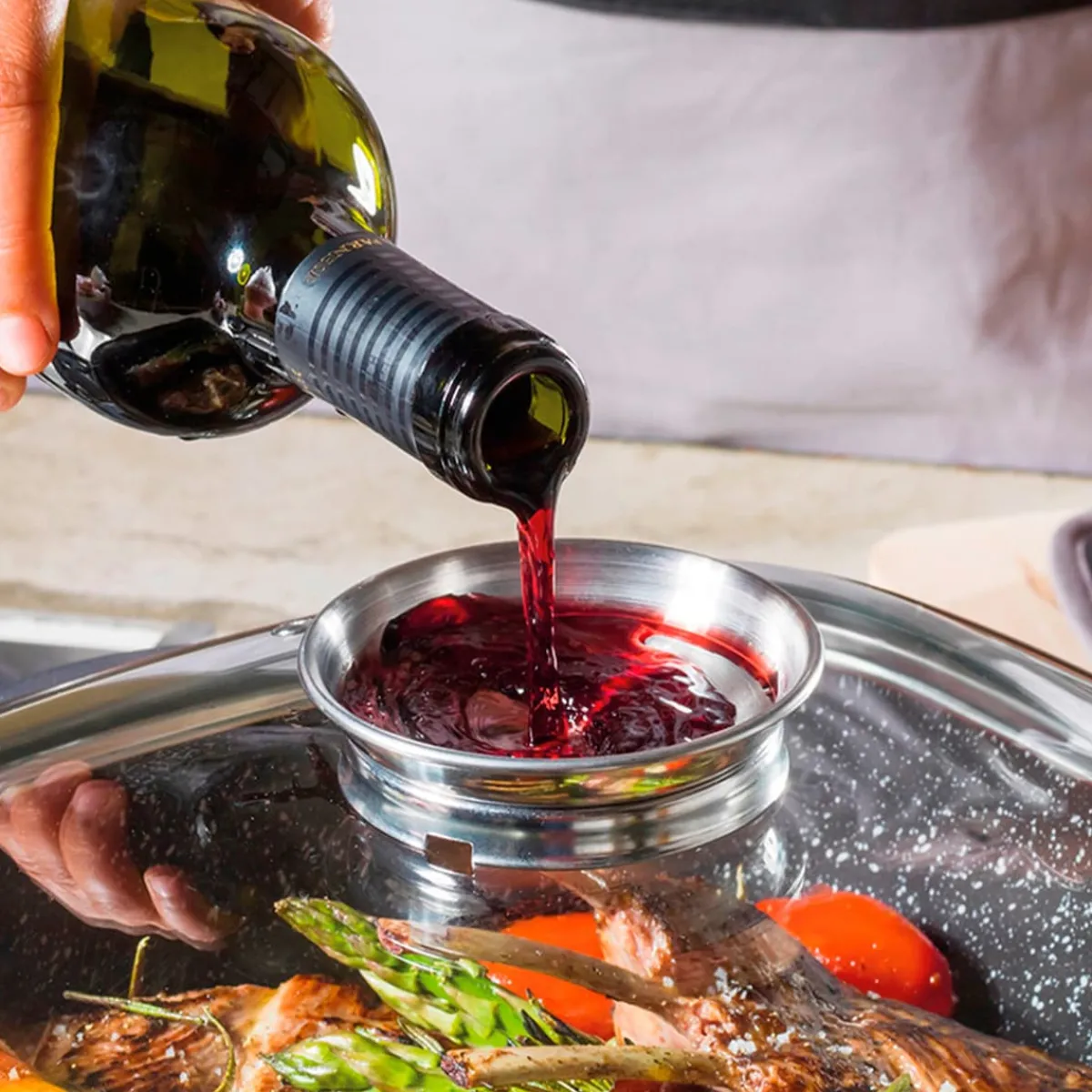 STONELINE – Das Original! Aroma-Glasdeckel mit Edelstahlrand Ermöglicht eine dosierte Zugabe von Flüssigkeiten über den Deckelknauf Passend für Eckpfannen und Bräter der Marke STONELINE und weitere ca. 28 x 28 cm Mit Abdampfventil