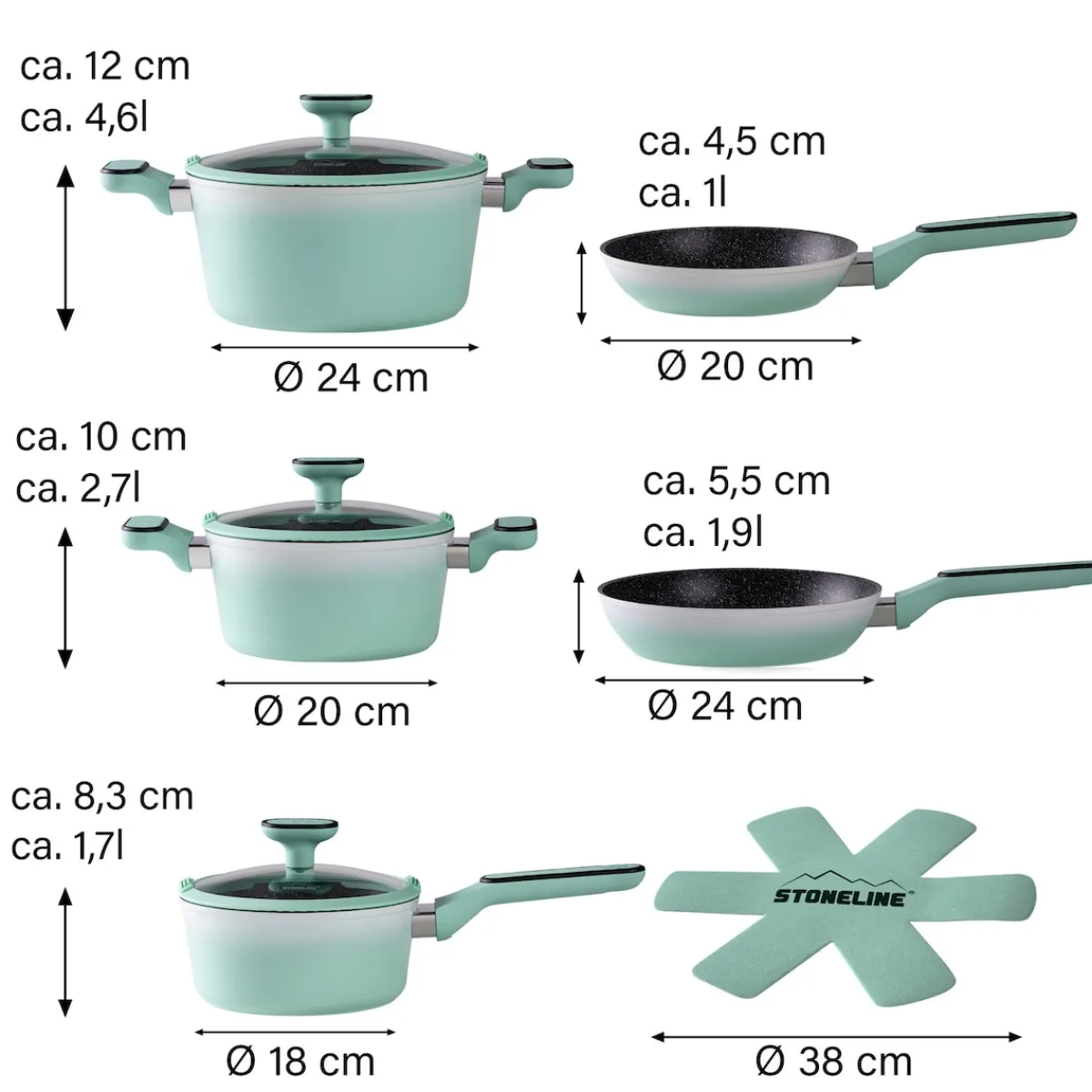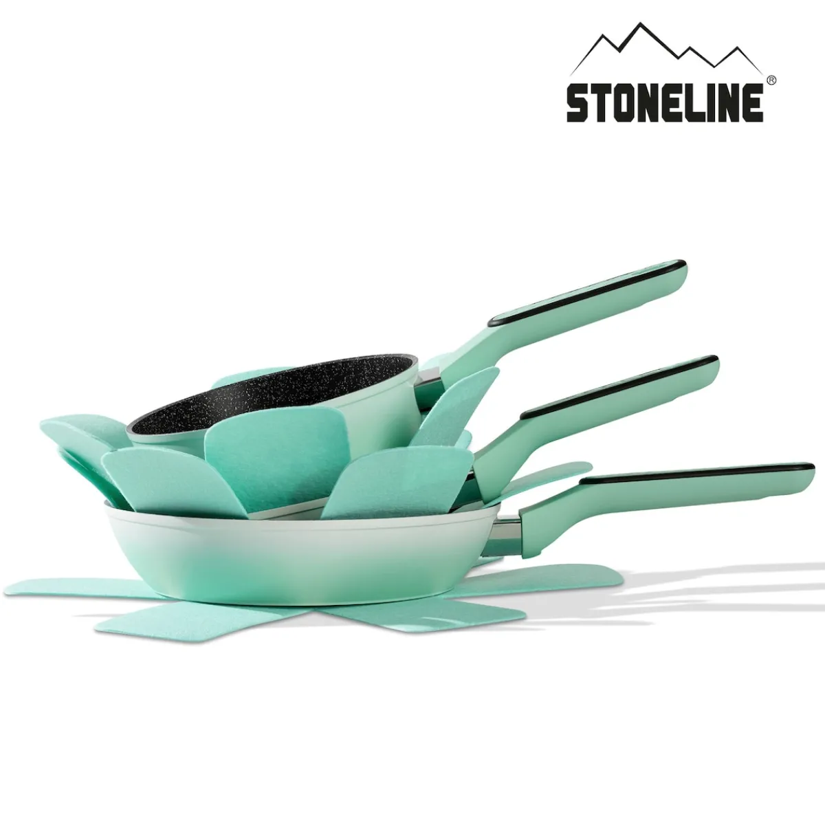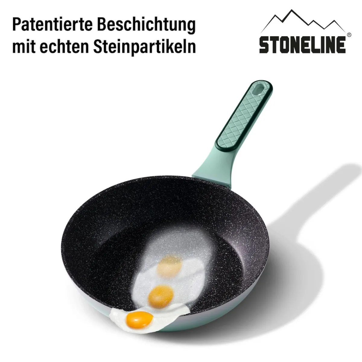 STONELINE – Das Original!Gesund fettfrei kochen und braten! Natürliche Frische und Klarheit als stilvoller Akzent. Verleihe deiner Küche einen frischen, modernen Look mit dem STONELINE Kochgeschirr-Set in der trendigen Farbe Mint. Der elegante Übergang von Weiß zu Mint setzt nicht nur stylische Akzente, sondern bringt auch eine natürliche Frische in deine Küche. Mit diesem Set machst du nicht nur dein Kochvergnügen bunter – du setzt auch ein Statement für modernes Design und kreative Gerichte! Dieses Set ist der perfekte Küchenhelfer für jeden Anlass. Egal, ob du schnell etwas braten oder ein aufwendigeres Gericht zaubern möchtest – mit den praktischen Töpfen, Pfannen und Deckeln hast du immer das richtige Kochgeschirr zur Hand und die Zubereitung deiner Lieblingsgerichte macht doppelt soviel Spaß. Die Glasdeckel mit Platinsilikonrand sind eine großartige Ergänzung zu deinem Kochgeschirr. Der Platinsilikonrand schützt nicht nur die Antihaftbeschichtung deiner Töpfe und Pfannen, sondern sorgt auch dafür, dass die Deckel bruchsicherer sind. Durch den gut schließenden Rand wird Energie effizienter genutzt und das Kochen noch schneller. Zudem bieten die Deckel eine praktische Ausschütt-Funktion, die das Abgießen von Flüssigkeiten erleichtert – ganz ohne zusätzliches Sieb. Der Knauf der Deckel bleibt angenehm kühl, damit du dich während des Kochvorgangs nicht verbrennst. So wird das Kochen noch komfortabler und sicherer! Mit diesem Kochgeschirr-Set kannst du dich auf jede Mahlzeit freuen, die du mit Liebe und Kreativität zubereitest. Es bringt nicht nur Stil in deine Küche, sondern sorgt auch dafür, dass du dich beim Kochen voll und ganz auf den Geschmack konzentrieren kannst. Hol dir das Set und genieße das Kochen in vollen Zügen! Dank der speziellen STONELINE Antihaftbeschichtung kannst du deine Speisen in den Pfannen und Töpfen – je nach Wunsch – mit oder ohne Bratfett und Ol zubereiten und sie ganz ohne Ankleben aus dem Kochgeschirr lösen. Es spielt keine Rolle, ob du auf Glaskeramik, Induktion, Elektro oder Gas kochst. In den Pfannen und Töpfen mit der original STONELINE Antihaftbeschichtung bleiben keine hartnäckigen Reste haften und die einfache Handwäsche spart dir Zeit und Mühe. Dieses Set besteht aus: 1 Bratentopf, ø ca. 24 cm, Höhe: ca. 12 cm, ca. 4,5 l, Induktionsboden: ø ca. 20,1 cm1 Kochtopf, ø ca. 20 cm, Höhe: ca. 10 cm, ca. 2,6 l, Induktionsboden: ø ca. 16,8 cm1 Stielkasserolle, ø ca. 18 cm, Höhe: ca. 8,3 cm, ca. 1,8 l, Induktionsboden: ø ca. 15 cm1 Bratpfanne, ø ca. 24 cm, Höhe: ca. 5,5 cm, ca. 1,9 l, Induktionsboden: ø ca. 18,8 cm1 Bratpfanne, ø ca. 20 cm, Höhe: ca. 4,5 cm, ca. 1,0 l, Induktionsboden: ø ca. 14,8 cm1 Glasdeckel, ø ca. 24 cm1 Glasdeckel, ø ca. 20 cm1 Glasdeckel, ø ca. 18 cm3 Vliespfannenschützer In der Farbe: Mint Die wichtigsten Vorteile auf einen Blick: Weltweit einzige Antihaftbeschichtung mit echten Steinpartikeln Kratzfeste STONELINE-Antihaftbeschichtung Glasdeckel mit Platinsilikonrand und Abschüttfunktion Vitaminschonend kochen und braten ohne Fett und Ol Optimales Bratergebnis und kross gebratenes Fleisch Auch für Vegetarier geeignet: Gemüse bleibt knackig und saftig Kein Anbrennen und kein Ankleben Super leicht zu reinigen dank Easy-Clean Effekt Extra starker, verzugsfreier Boden Bodenstärke: ca. 3,5 mm Für alle Herdarten geeignet, auch Induktion Backofengeeignet bis 150 °C Material: Aluminium Reinigungs- und Pflegetipps: Vor dem ersten Gebrauch empfehlen wir, dein Koch- oder Backgeschirr mit etwas Wasser und einem milden Spülmittel gründlich auszuwaschen. Verteile anschließend mit einem Papierküchentuch einige Tropfen Speiseöl auf der Beschichtung.Bei der weiteren Nutzung kannst du auf den Einsatz von Fett oder Ol verzichten!Dank dem Easy-Clean-Effekt wird die Reinigung per Hand empfohlen. Einfach mit heißem Wasser, Handspülmittel und einem weichen Schwamm auswischen.