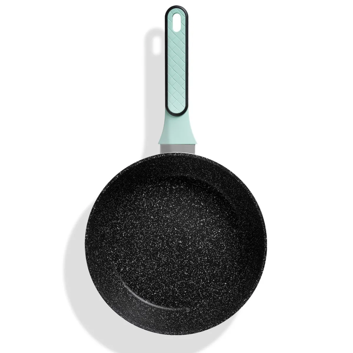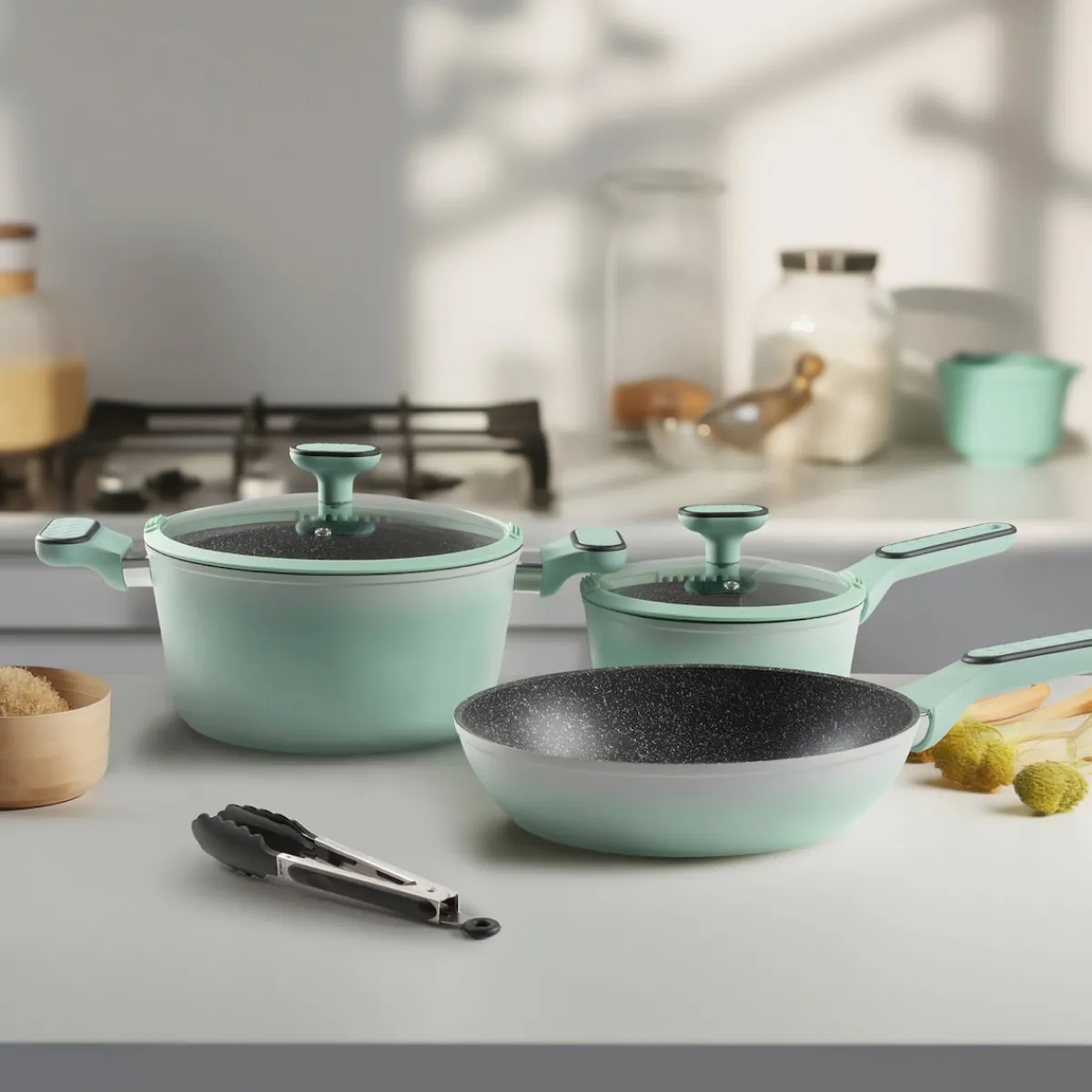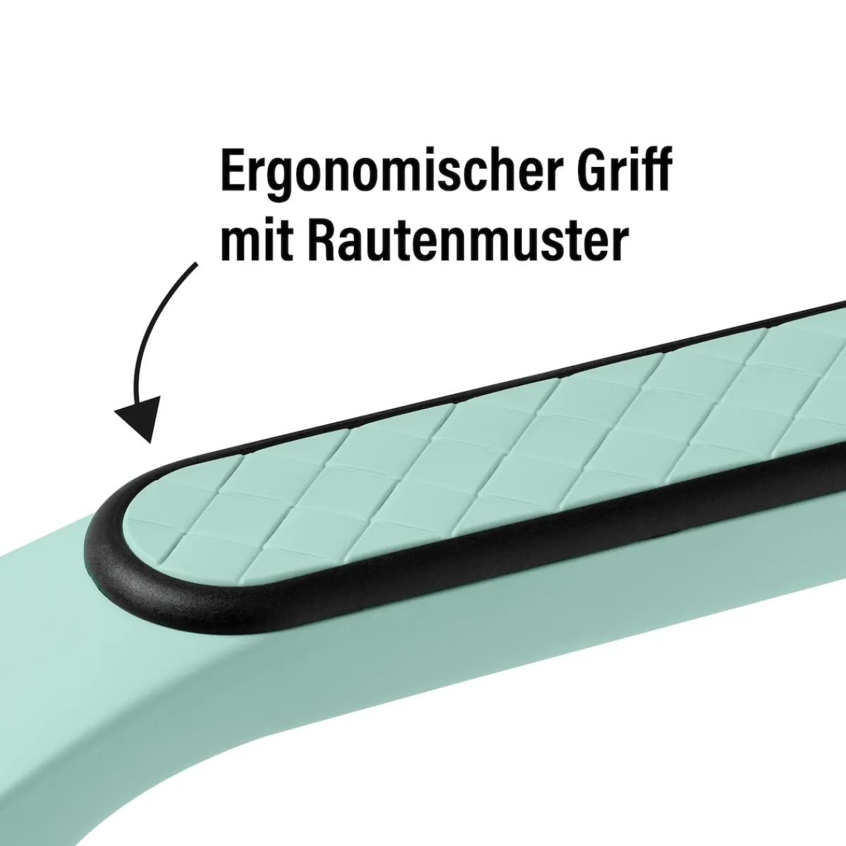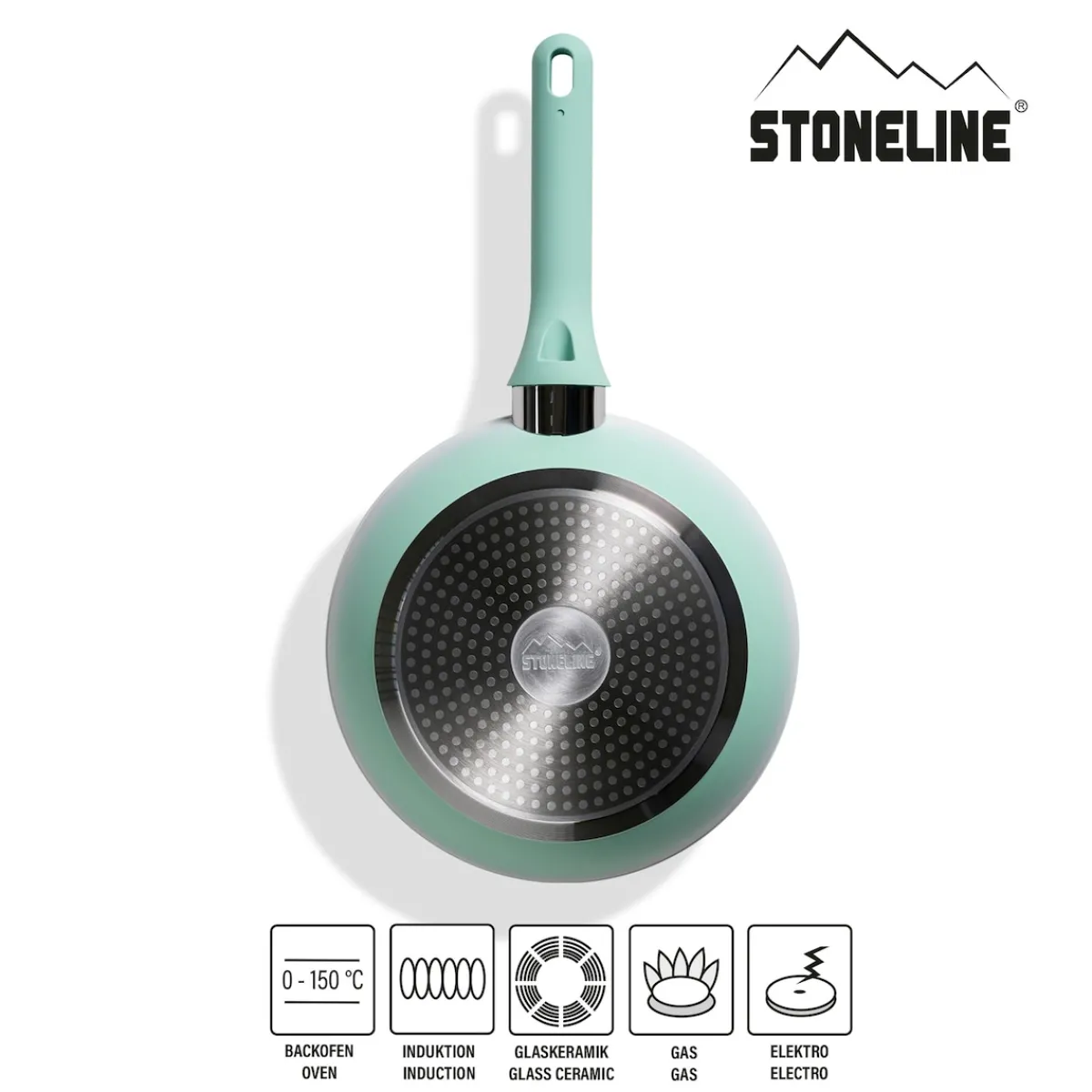 STONELINE – Das Original!Gesund fettfrei kochen und braten! Natürliche Frische und Klarheit als stilvoller Akzent. Verleihe deiner Küche einen frischen, modernen Look mit dem STONELINE Kochgeschirr-Set in der trendigen Farbe Mint. Der elegante Übergang von Weiß zu Mint setzt nicht nur stylische Akzente, sondern bringt auch eine natürliche Frische in deine Küche. Mit diesem Set machst du nicht nur dein Kochvergnügen bunter – du setzt auch ein Statement für modernes Design und kreative Gerichte! Dieses Set ist der perfekte Küchenhelfer für jeden Anlass. Egal, ob du schnell etwas braten oder ein aufwendigeres Gericht zaubern möchtest – mit den praktischen Töpfen, Pfannen und Deckeln hast du immer das richtige Kochgeschirr zur Hand und die Zubereitung deiner Lieblingsgerichte macht doppelt soviel Spaß. Die Glasdeckel mit Platinsilikonrand sind eine großartige Ergänzung zu deinem Kochgeschirr. Der Platinsilikonrand schützt nicht nur die Antihaftbeschichtung deiner Töpfe und Pfannen, sondern sorgt auch dafür, dass die Deckel bruchsicherer sind. Durch den gut schließenden Rand wird Energie effizienter genutzt und das Kochen noch schneller. Zudem bieten die Deckel eine praktische Ausschütt-Funktion, die das Abgießen von Flüssigkeiten erleichtert – ganz ohne zusätzliches Sieb. Der Knauf der Deckel bleibt angenehm kühl, damit du dich während des Kochvorgangs nicht verbrennst. So wird das Kochen noch komfortabler und sicherer! Mit diesem Kochgeschirr-Set kannst du dich auf jede Mahlzeit freuen, die du mit Liebe und Kreativität zubereitest. Es bringt nicht nur Stil in deine Küche, sondern sorgt auch dafür, dass du dich beim Kochen voll und ganz auf den Geschmack konzentrieren kannst. Hol dir das Set und genieße das Kochen in vollen Zügen! Dank der speziellen STONELINE Antihaftbeschichtung kannst du deine Speisen in den Pfannen und Töpfen – je nach Wunsch – mit oder ohne Bratfett und Ol zubereiten und sie ganz ohne Ankleben aus dem Kochgeschirr lösen. Es spielt keine Rolle, ob du auf Glaskeramik, Induktion, Elektro oder Gas kochst. In den Pfannen und Töpfen mit der original STONELINE Antihaftbeschichtung bleiben keine hartnäckigen Reste haften und die einfache Handwäsche spart dir Zeit und Mühe. Dieses Set besteht aus: 1 Bratentopf, ø ca. 24 cm, Höhe: ca. 12 cm, ca. 4,5 l, Induktionsboden: ø ca. 20,1 cm1 Kochtopf, ø ca. 20 cm, Höhe: ca. 10 cm, ca. 2,6 l, Induktionsboden: ø ca. 16,8 cm1 Stielkasserolle, ø ca. 18 cm, Höhe: ca. 8,3 cm, ca. 1,8 l, Induktionsboden: ø ca. 15 cm1 Bratpfanne, ø ca. 24 cm, Höhe: ca. 5,5 cm, ca. 1,9 l, Induktionsboden: ø ca. 18,8 cm1 Bratpfanne, ø ca. 20 cm, Höhe: ca. 4,5 cm, ca. 1,0 l, Induktionsboden: ø ca. 14,8 cm1 Glasdeckel, ø ca. 24 cm1 Glasdeckel, ø ca. 20 cm1 Glasdeckel, ø ca. 18 cm3 Vliespfannenschützer In der Farbe: Mint Die wichtigsten Vorteile auf einen Blick: Weltweit einzige Antihaftbeschichtung mit echten Steinpartikeln Kratzfeste STONELINE-Antihaftbeschichtung Glasdeckel mit Platinsilikonrand und Abschüttfunktion Vitaminschonend kochen und braten ohne Fett und Ol Optimales Bratergebnis und kross gebratenes Fleisch Auch für Vegetarier geeignet: Gemüse bleibt knackig und saftig Kein Anbrennen und kein Ankleben Super leicht zu reinigen dank Easy-Clean Effekt Extra starker, verzugsfreier Boden Bodenstärke: ca. 3,5 mm Für alle Herdarten geeignet, auch Induktion Backofengeeignet bis 150 °C Material: Aluminium Reinigungs- und Pflegetipps: Vor dem ersten Gebrauch empfehlen wir, dein Koch- oder Backgeschirr mit etwas Wasser und einem milden Spülmittel gründlich auszuwaschen. Verteile anschließend mit einem Papierküchentuch einige Tropfen Speiseöl auf der Beschichtung.Bei der weiteren Nutzung kannst du auf den Einsatz von Fett oder Ol verzichten!Dank dem Easy-Clean-Effekt wird die Reinigung per Hand empfohlen. Einfach mit heißem Wasser, Handspülmittel und einem weichen Schwamm auswischen.