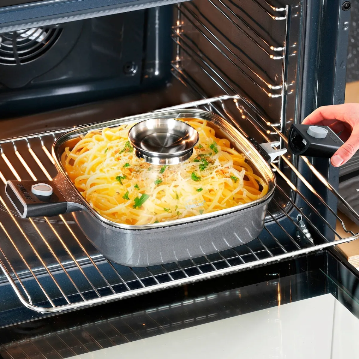 STONELINE – Das Original! Gesund fettfrei kochen und braten! STONELINE Smart – Das intelligente Kochgeschirr für deine Küche Mit der STONELINE Smart Serie wird Kochen, Backen und Servieren so einfach und flexibel wie nie zuvor! Das hochwertige Kochgeschirr aus Aluguss kombiniert durchdachte Funktionen mit modernem Design, langanhaltender Qualität und maximalem Komfort. Der abnehmbare Griff macht das Kochgeschirr besonders vielseitig: Spare Platz bei der Zubereitung auf dem Herd, beim Servieren auf dem Esstisch und bei der Aufbewahrung im Kühlschrank. Außerdem wird dein Kochgeschirr mit abgenommenen Griffen im Handumdrehen ofenfest. Du kannst die Pfannen beispielsweise als Auflaufformen zum Überbacken von Gerichten verwenden. Das spart Zeit und auch zusätzliches Koch- und Backgeschirr. Die eckige Servierpfanne überzeugt überall dort, wo eine runde Pfanne an ihre Grenzen stößt. Verwende sie als Bratpfanne, Schmorpfanne, Auflaufform, Backform oder Kasserolle – multifunktionell, robust, hitzebeständig! Die Eckpfanne ist folglich die perfekte Allround-Pfanne für die Küche. Mit ihrer eckigen Form bietet sie doppelt so viel Bratfläche in Vergleich zu einer runden Pfanne derselben Größe. Wer den unschlagbaren Vorteil kennt, wird die Pfanne nicht mehr missen wollen. Sie ist absolut geräumig und bieten auch für größere Portionen ausreichend Platz. Im Lieferumfang sind drei Griffe enthalten: zwei kurze Griffe und ein langer Griff. Diese sind austauschbar, sodass du die Pfanne je nach Bedarf entweder mit dem langen Griff und kurzem Gegengriff als Schmorpfanne oder mit den beiden kurzen Griffen als praktische Servierpfanne verwenden kannst. Der Deckel der Eckpfanne überzeugt durch seine Aroma-Funktion. Er ermöglicht es dir, deinen Gerichten Flüssigkeiten wie Wein, flüssige Gewürze oder Essenzen direkt über den Deckelknauf hinzuzufügen – so kannst du den Geschmack deiner Gerichte gezielt verfeinern und das sowohl auf dem Herd, als auch im Backofen. Ob Pfanne, Topf oder ganzes Topfset – die STONELINE Smart Serie überzeugt durch ihr robustes Aluminiumguss-Material und garantiert eine optimale Wärmespeicherung und ein energieeffizientes Kochen. Es ist für alle Herdarten geeignet, auch für Induktion. Dank der patentierten STONELINE Antihaftbeschichtung mit echten Steinpartikeln kannst du gesund fettfrei braten, ohne dass etwas haften bleibt oder anbrennt. Die Reinigung ist kinderleicht und spart dir Zeit – meist genügt es, die Pfanne oder den Topf einfach mit etwas Spülmittel, heißem Wasser und einem feuchten Tuch auszuwischen und das Kochgeschirr ist sofort wieder einsatzbereit. Lieferumfang: 1 Eckpfanne, ca. 24 x 24 cm, Höhe: ca. 7 cm, ca. 3,3 l, Induktionsfläche ø ca. 20 cm 1 Glasdeckel mit Aroma-Funktion, ca. 24 x 24 cm2 Kurze Griffe1 Langer Griff In der Farbe: Grau Die wichtigsten Vorteile auf einen Blick: Weltweit einzige Antihaftbeschichtung mit echten Steinpartikeln Kratzfeste STONELINE-Antihaftbeschichtung Abnehmbare Griffe für flexible Einsatzmöglichkeiten Vitaminschonend kochen und braten ohne Fett und Öl Optimales Bratergebnis und kross gebratenes Fleisch Auch für Vegetarier geeignet: Gemüse bleibt knackig und saftig Kein Anbrennen und kein Ankleben Super leicht zu reinigen dank Easy-Clean Effekt Extra starker, verzugfreier Boden Bodenstärke: ca. 4,5 mm Für alle Herdarten geeignet, auch Induktion Backofengeeignet bis 240 °C (ohne Griff, ohne Deckel) / 180 °C (mit Griff, mit Deckel) Material: Aluminiumguss aus 90 % recyceltem Material Reinigungs- und Pflegetipps: Vor dem ersten Gebrauch empfehlen wir, dein Koch- oder Backgeschirr mit etwas Wasser und einem milden Spülmittel gründlich auszuwaschen. Verteile anschließend mit einem Papierküchentuch einige Tropfen Speiseöl auf der Beschichtung.Bei der weiteren Nutzung kannst du auf den Einsatz von Fett oder Öl verzichten!Dank dem Easy-Clean-Effekt wird die Reinigung per Hand empfohlen. Einfach mit heißem Wasser, Handspülmittel und einem weichen Schwamm auswischen.