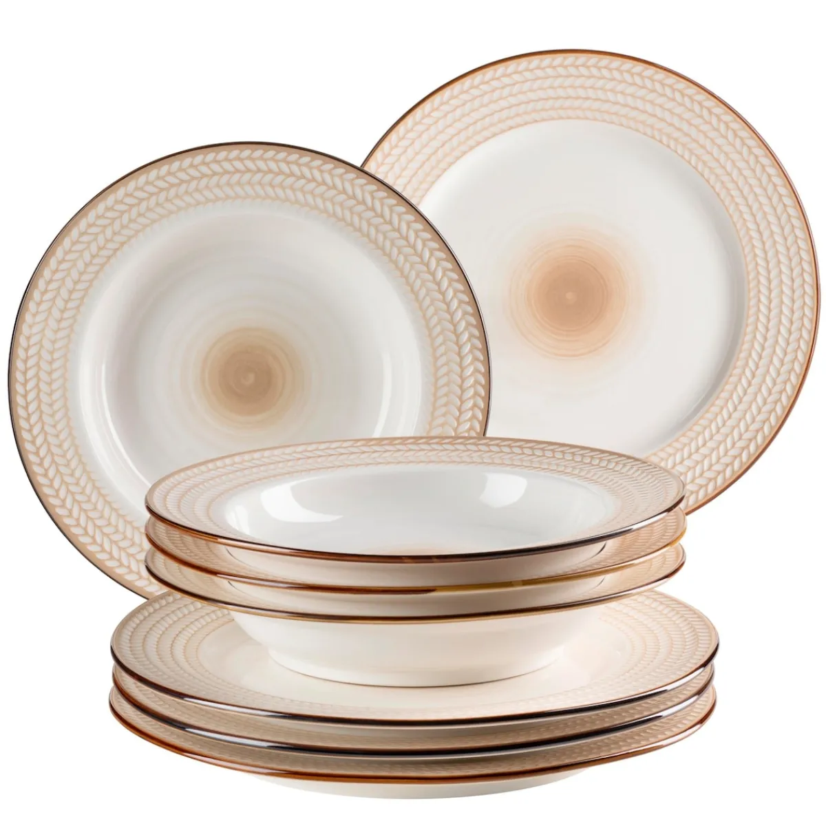 Aufregend exquisit präsentiert sich die ausdrucksstarke Premium-Kollektion „Prospero“ der österreichischen Traditionsmarke MÄSER. Eine an geschichtsträchtige Lorbeerkränze erinnernde, haptisch fühlbare Reliefstruktur umläuft ein handgepinseltes Spiraldekor, welches jedes Teil zu einem echten Unikat macht. Gefertigt aus robustem und langlebigem Durable Porzellan in dickwandiger, schwerer Qualität erfüllt diese Tafelgeschirr-Serie die besonderen Ansprüche der gehobenen Gastronomie und anspruchsvoller Privatkunden. Die einzigartige Kombination aus fließender Dynamik und selbstbewusster Eleganz wird sanft eingerahmt durch eine händisch aufgemalte, unregelmäßig schimmernde ockerfarbene Umrandung. Die sorgfältig aufeinander abgestimmten Farben dieser Kollektion ermöglichen einen täglich neu erschaffenen Esstisch, der optisch perfekt zu Ihren Speisen passt. Selbstverständlich ist die gesamte Serie „Prospero“ mikrowellengeeignet und dauerhaft spülmaschinenfest. Dieses Set wird in einer sicheren Transportverpackung aus ressourcenschonenden Materialien versendet. Bitte beachten Sie: Für eine objektive Vergleichbarkeit gehen unsere Füllmengenangaben von einer randvollen Befüllung aus. Aufgrund des hohen handwerklichen Anteils sind kleine Unregelmäßigkeiten und Farbabweichungen in der Glasur möglich.