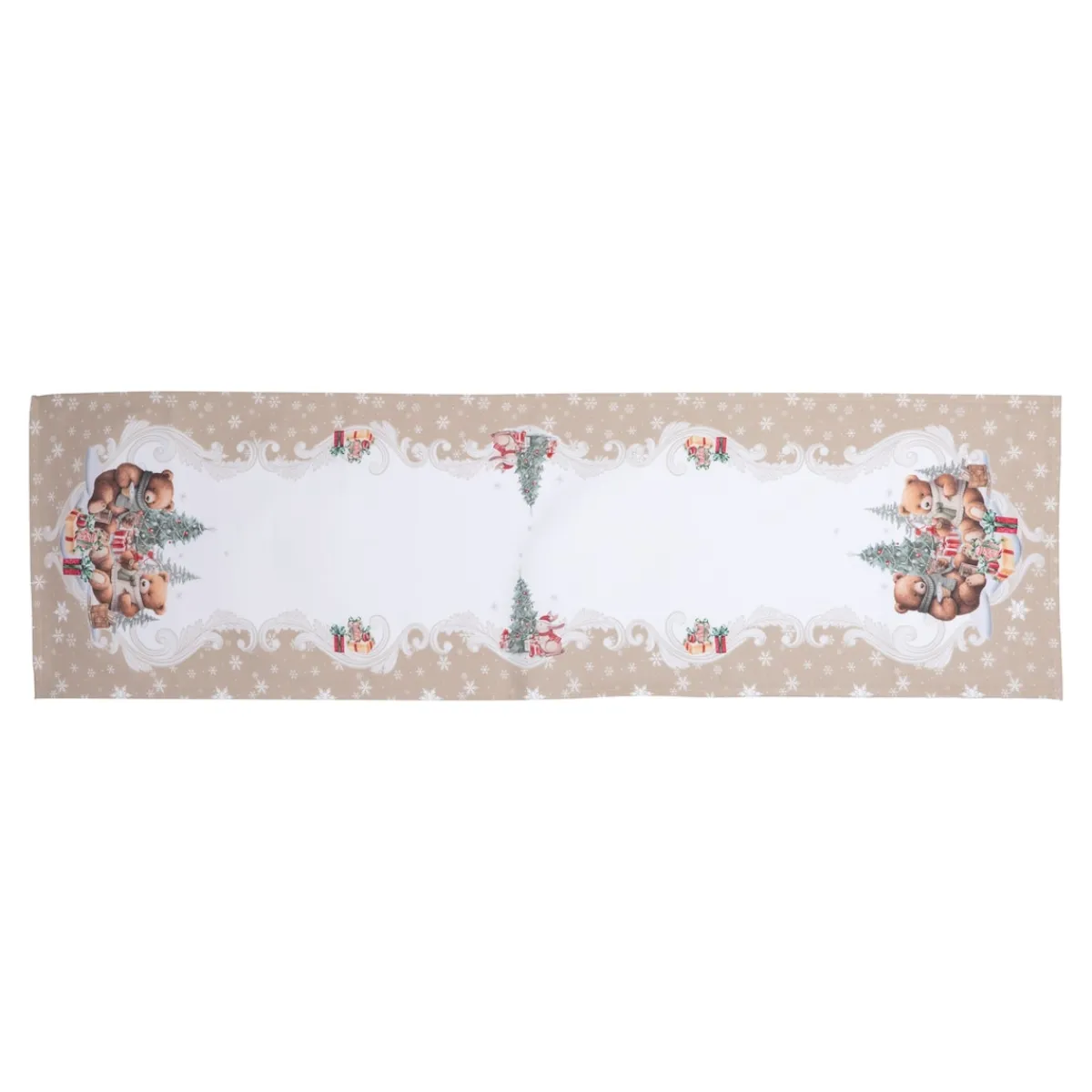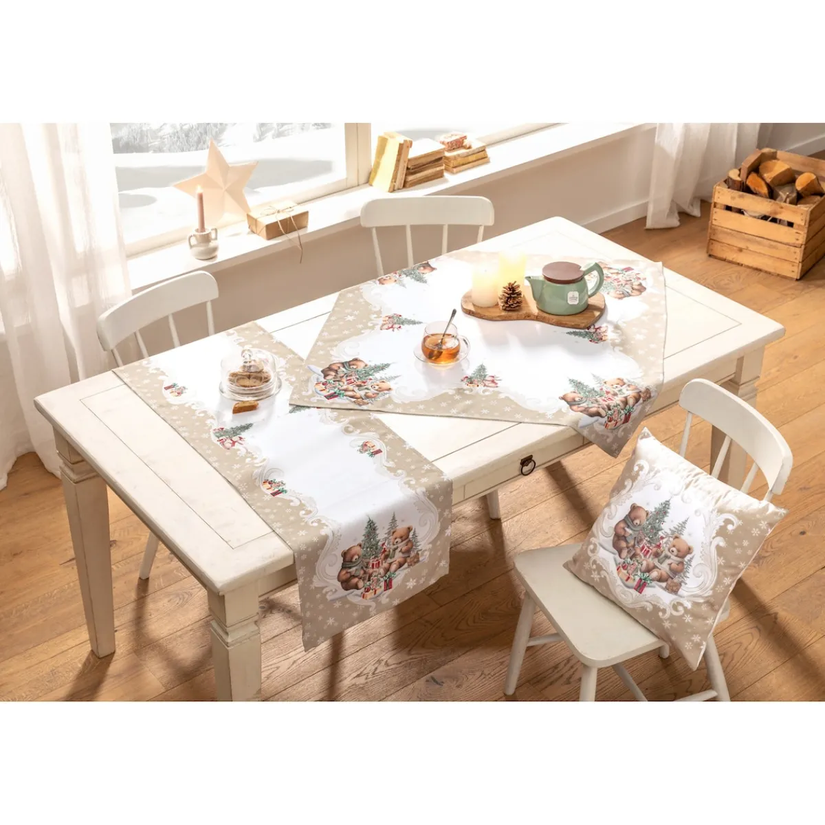Lassen Sie sich von weihnachtlicher Gemütlichkeit verzaubern – mit dem Tischläufer „Teddy Bescherung“. Die liebevoll gestalteten Teddybären im weihnachtlichen Design zaubern Wärme und Freude auf Ihren Esstisch. Ideal für die Adventszeit und die perfekte Ergänzung für Ihre weihnachtliche Tischdekoration. Machen Sie Ihre Festtafel zur echten „Teddy-Bescherung“!