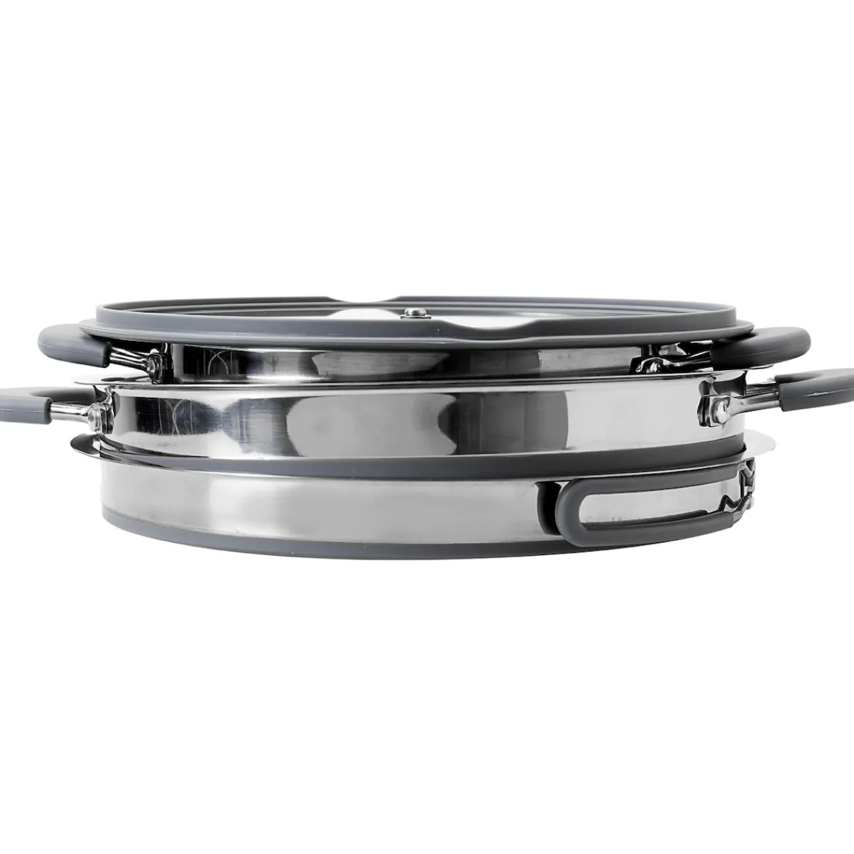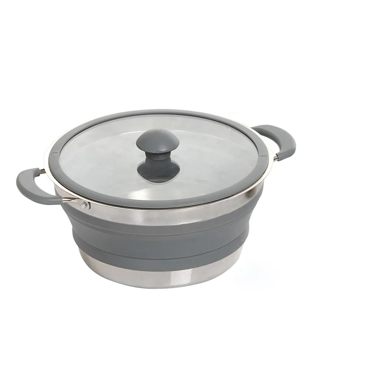 Entdecken Sie unser kompaktes Kochset – ideal für Wohnmobile und Camping. Mit einem zusammenklappbaren Topf, einer Pfanne mit Klappgriffen, einer Abtropfschale und einem Glasdeckel. Alle Teile sind platzsparend zusammenklappbar. Der Silikon-Mittelteil, Edelstahlring und der gläserne Deckel mit Anti-Rutsch-Rand bieten Qualität und Vielseitigkeit. Die temperaturisolierten Griffe sorgen für sicheres Handling. Dieses Set passt auf Elektro- und Gasherde. Genießen Sie kulinarische Freiheit auf kleinem Raum und erleben Sie das Abenteuer des mobilen Kochens!