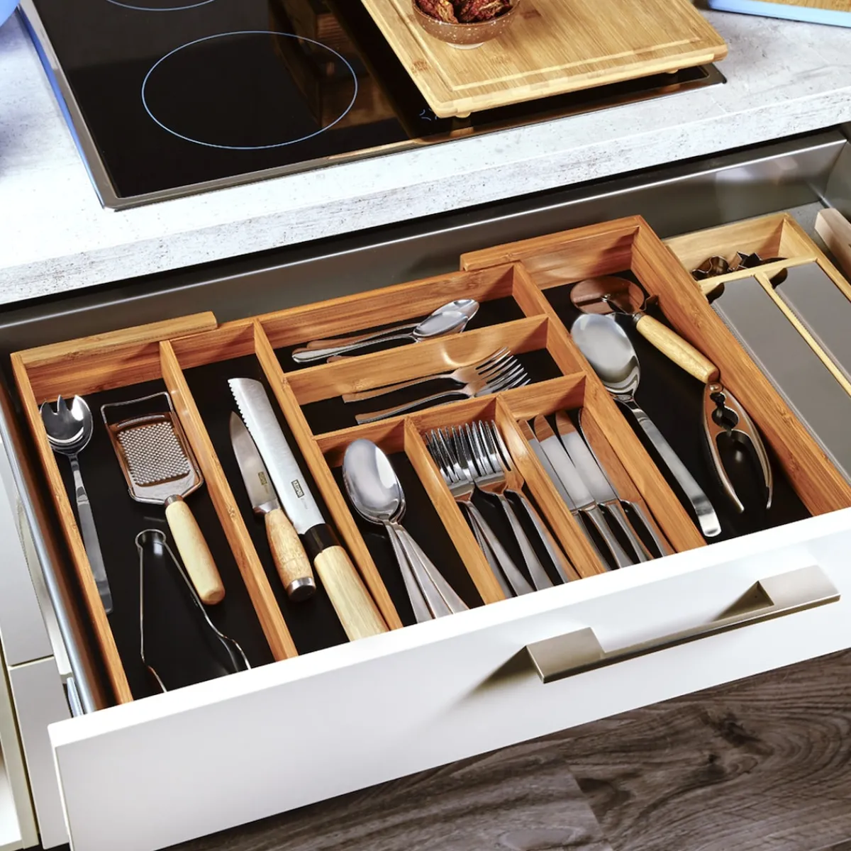 Mit diesem variablen Besteckkasten bringen Sie im Handumdrehen Ordnung in jede Schublade. Die praktische Ausziehfunktion schafft zusätzliche Fächer und passt sich Ihrem Platzbedarf an. Ob in der Küche, im Bad oder im Hobbyraum – Sie entscheiden, was Sie darin aufbewahren. Besteck, Kosmetik, Werkzeug oder Kleinteile: Alles hat endlich seinen festen Platz.