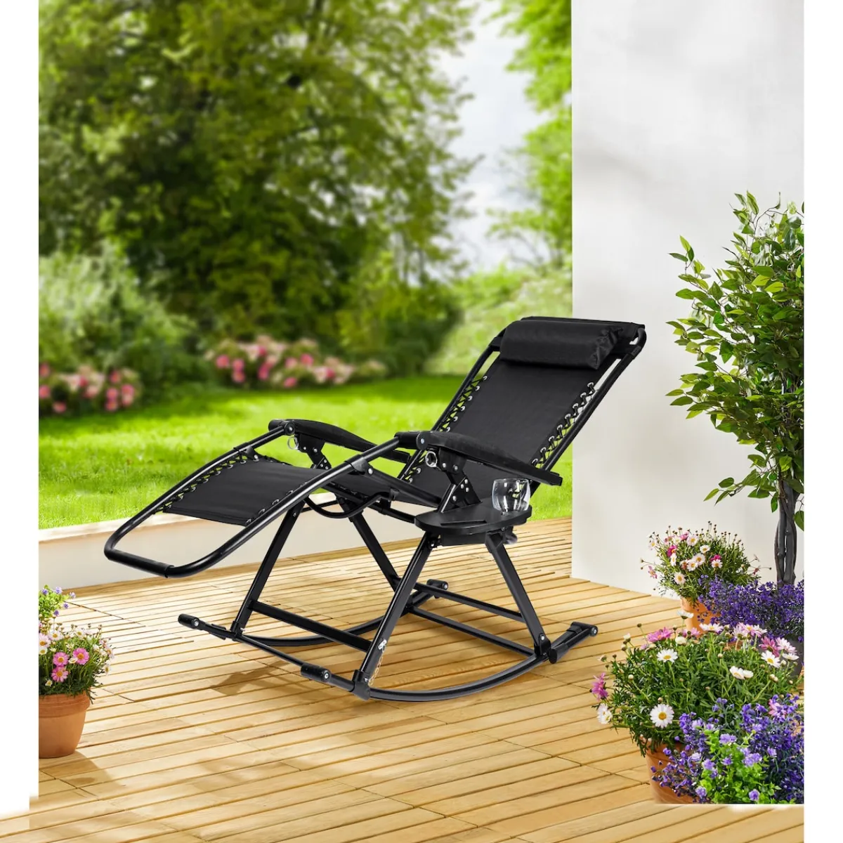 Gönnen Sie sich pure Erholung im eigenen Garten: Ruck, zuck ist der Schaukelstuhl mit höhenverstellbarem Kopfkissen aufgestellt, und Sie können bei einem Buch das gute Gefühl einer entspannten Haltung von Kopf bis Fuß genießen. Dank ausklappbarer Stellfüße wird der vielseitige Stuhl im Nu sogar zur Liege.