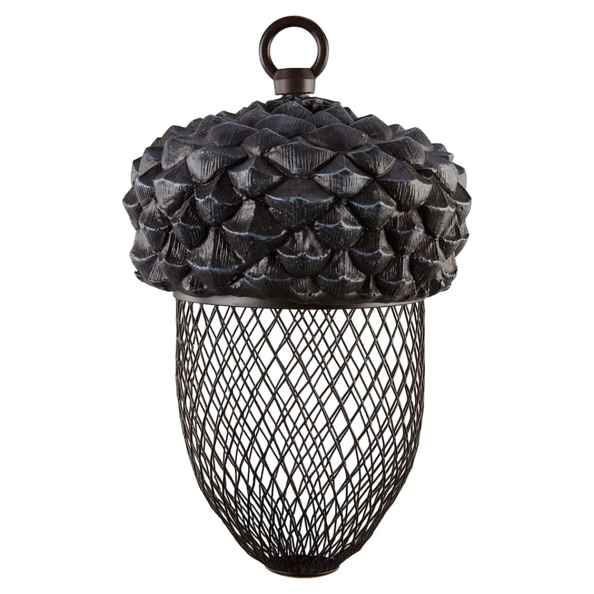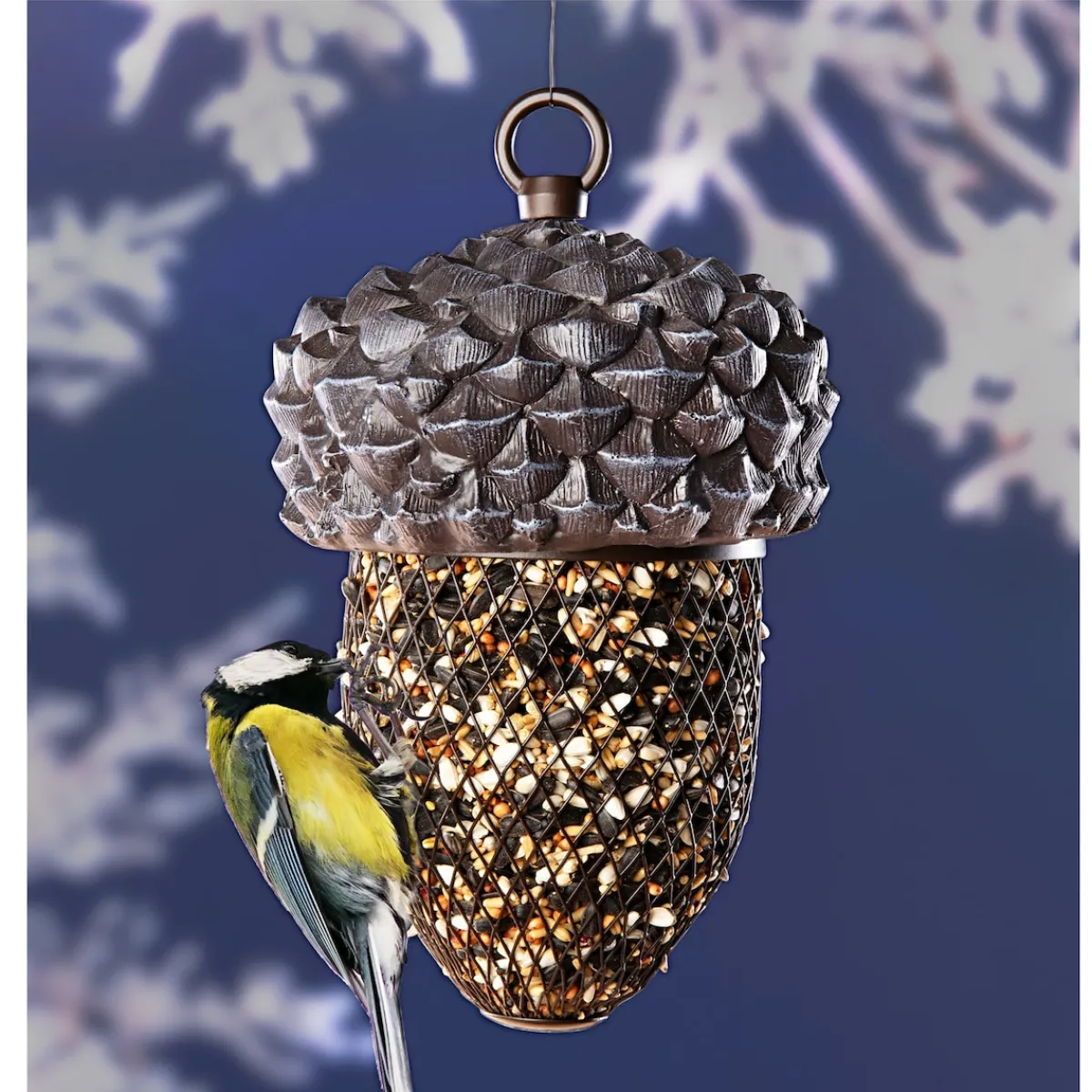 An dieser „Eichel“ werden Vögel nicht nur in der kalten Jahreszeit gerne hängen. Einfach die Futterstelle aufhängen und das Futter ins Drahtgeflecht einfüllen, an dem die Vögel beim Fressen zudem guten Halt finden.