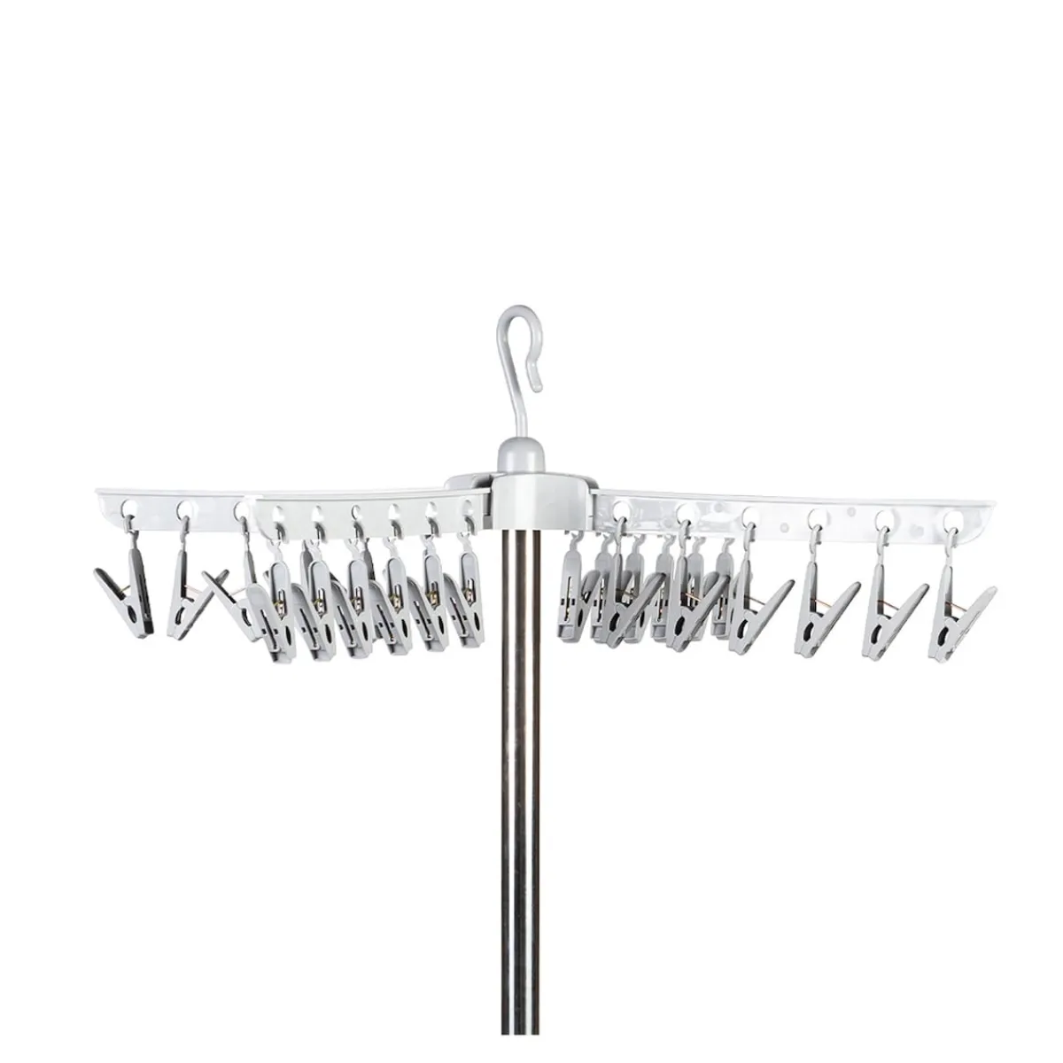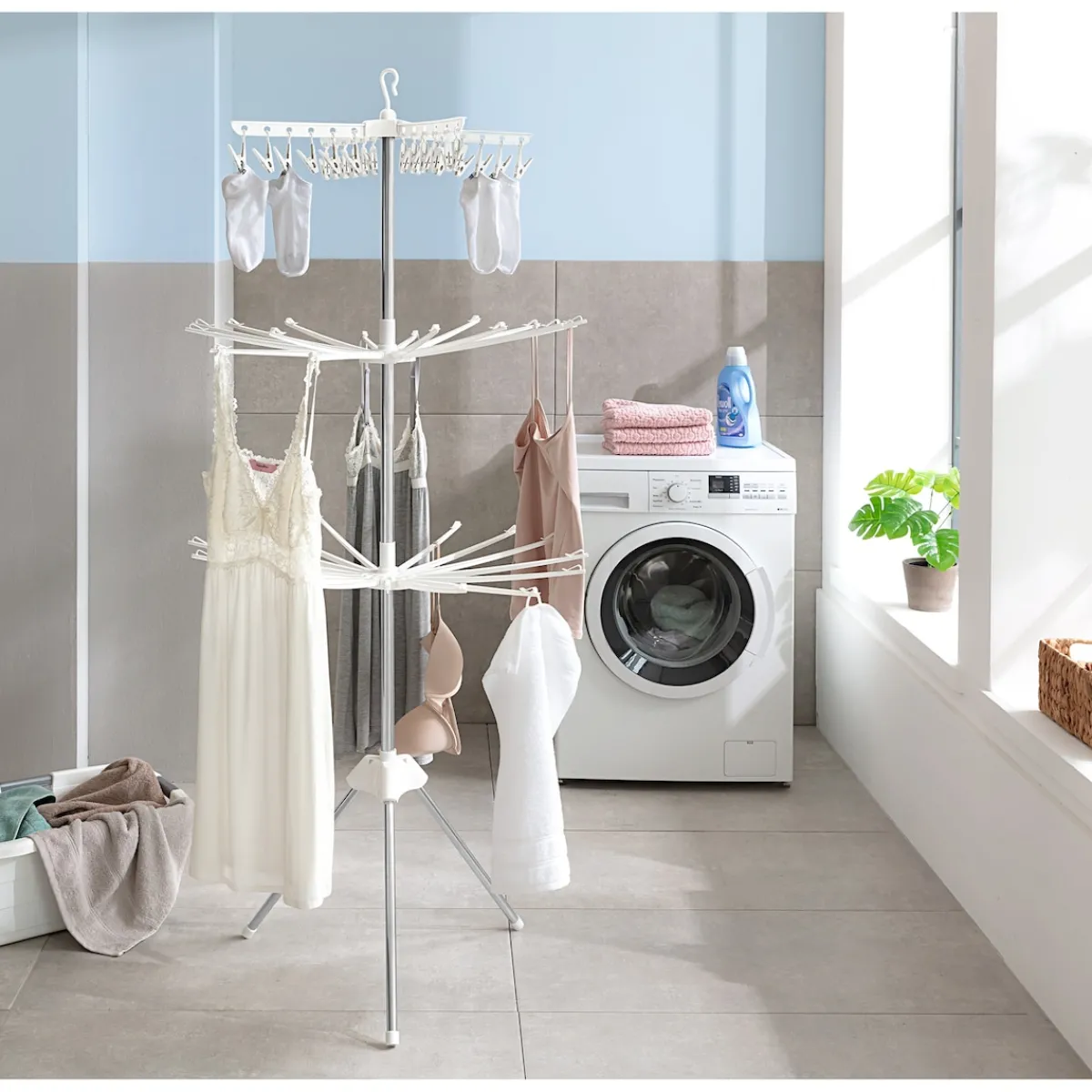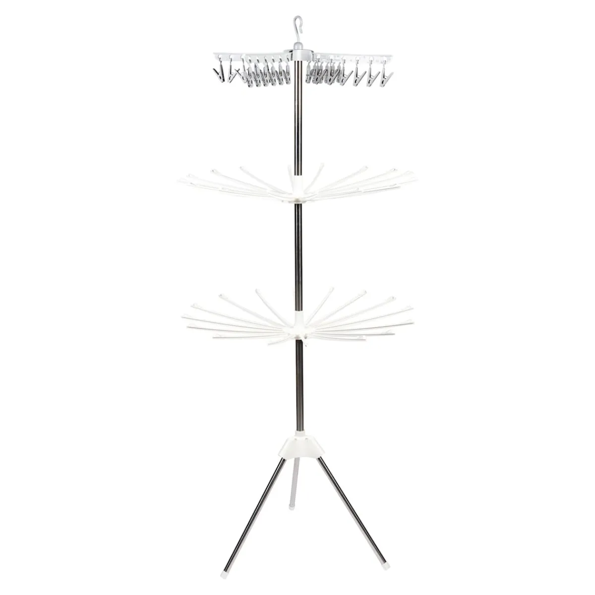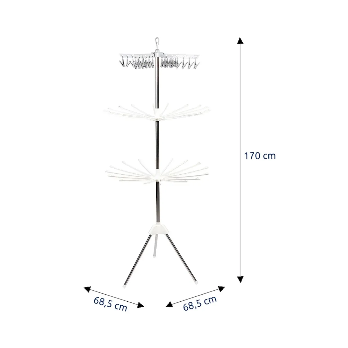 Ob zum Auslüften oder Trocknen – auf 3 Etagen bietet dieser Wäschetrockner luftigen Freiraum für Unterwäsche oder Tops. Die Klammern der obersten Ebene halten Socken & Co. auch bei Wind sicher fest. Alle Ebenen und die Beine sind platzsparend einklappbar.