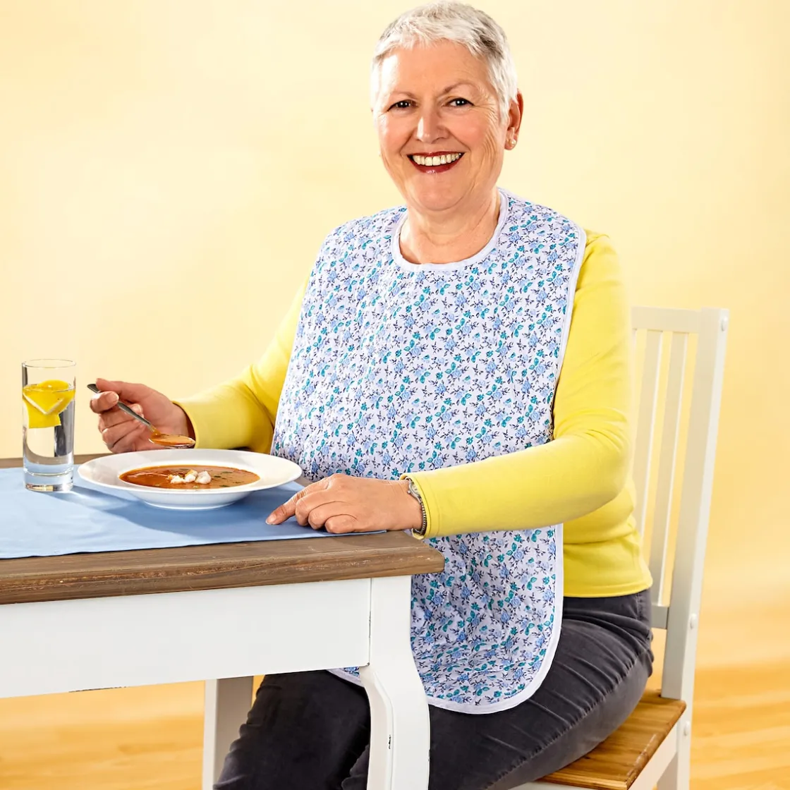 Unverkrampft essen und trinken, trotz frisch angezogener Kleidung oder aufgrund motorischer Schwächen! Mit diesem Riesenlatz ist es völlig egal, ob etwas danebengeht. Er beeindruckt durch die Übergröße, das einfache Anlegen und ein schönes Blumenmuster.