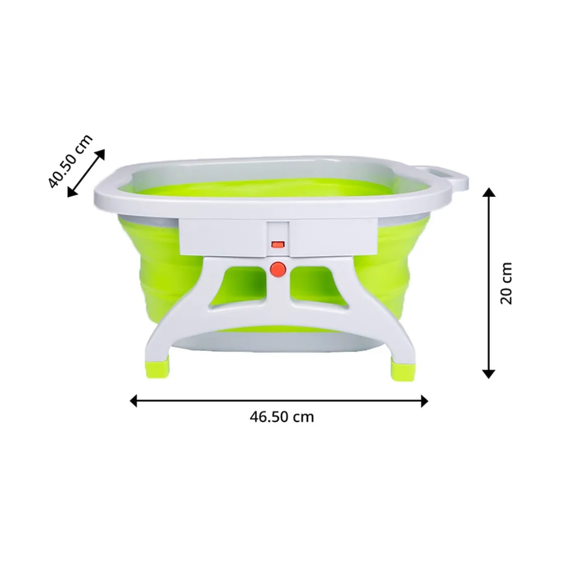 Um den Füßen eine wohlverdiente Auszeit zu gönnen, werden die Seitenteile des in modernem hellgrün und grau gestalteten Wellness-Pools einfach ausgeklappt und der Boden nach unten gedrückt. Sobald die Seiten eingerastet sind, kann auch schon das Wasser eingelassen werden. Jetzt heißt es: rein mit den Füßen, zurücklehnen und entspannen! Für einen sicheren Stand auf glatten Untergründen wie Fliesen oder Laminat sorgen währenddessen die vier rutschfesten Gummifüße. Ist das Fußbad getrocknet, genügt es auf die roten Knöpfe an den Seitenteilen zu drücken, um es wieder platzsparend zusammenzufalten.