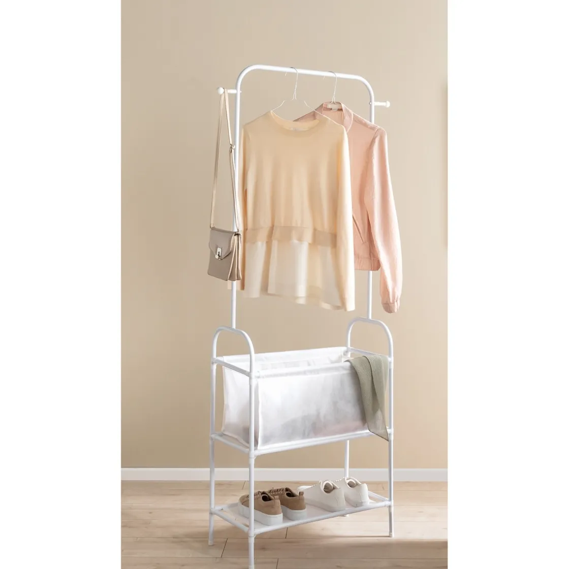Aufräumen leicht gemacht: Diese vielseitige Kleiderstange ist dank ihres schlichten Designs die perfekte Ergänzung in jedem Zuhause. Mit einem integrierten Aufbewahrungsfach und der praktischen Schuhablage bietet sie nicht nur Platz für Jacken & Co., sondern auch für Ihre Schuhe und Accessoires. Elegant und funktional zugleich schafft sie sofort mehr Ordnung und Übersicht. Mit praktischen Haken für Taschen, Schals u.v.m.