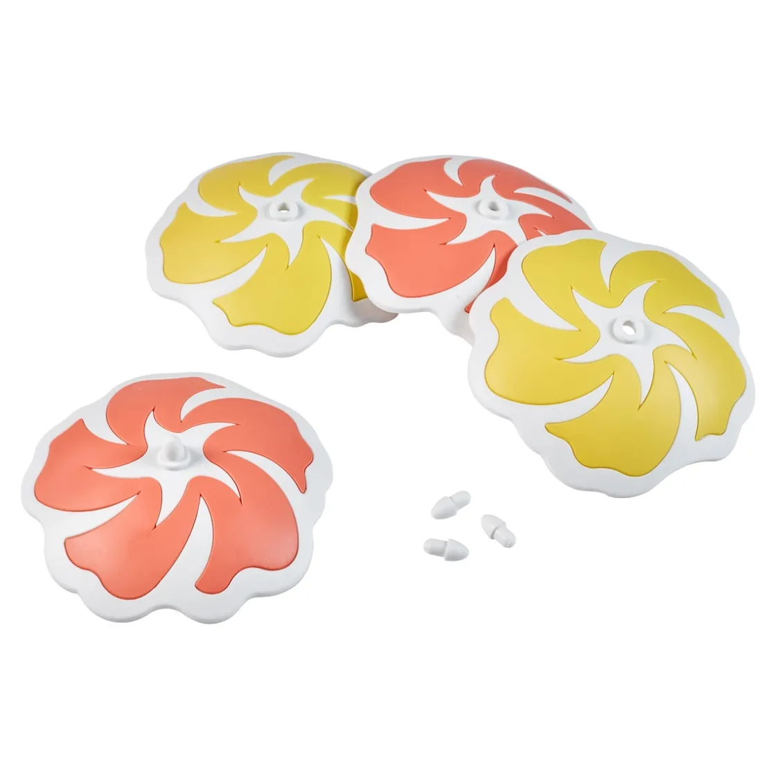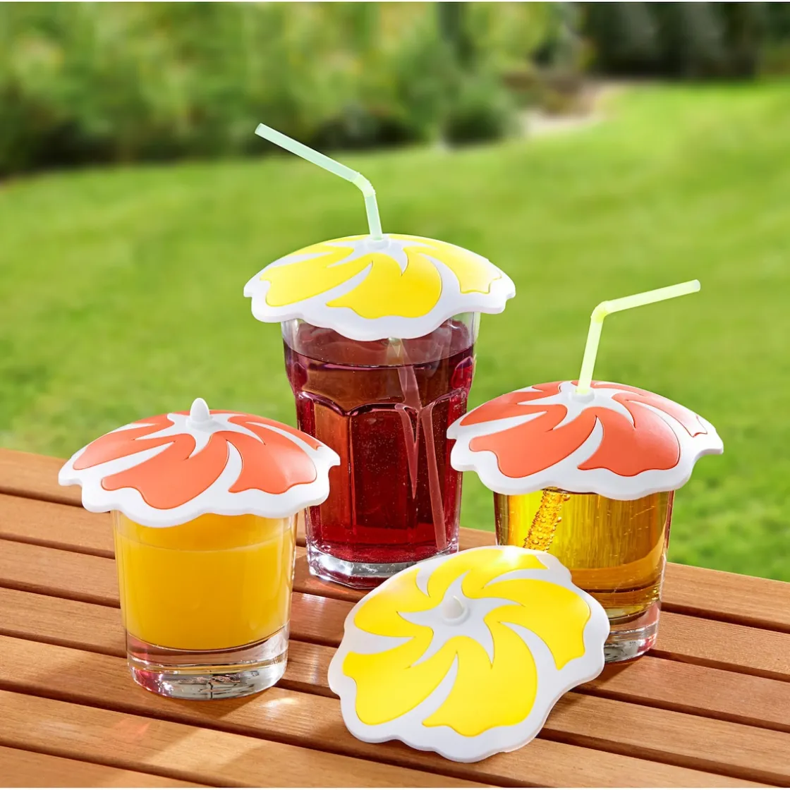 Mit diesen Abdeckungen bleibt der Geschmack im Glas und die Fliegen und Wespen draußen. Durch das mittige Loch kann ein Strohhalm geschoben werden. Mit Stöpsel. Sehr hübsches Blumen-Design in Gelb und Rot.