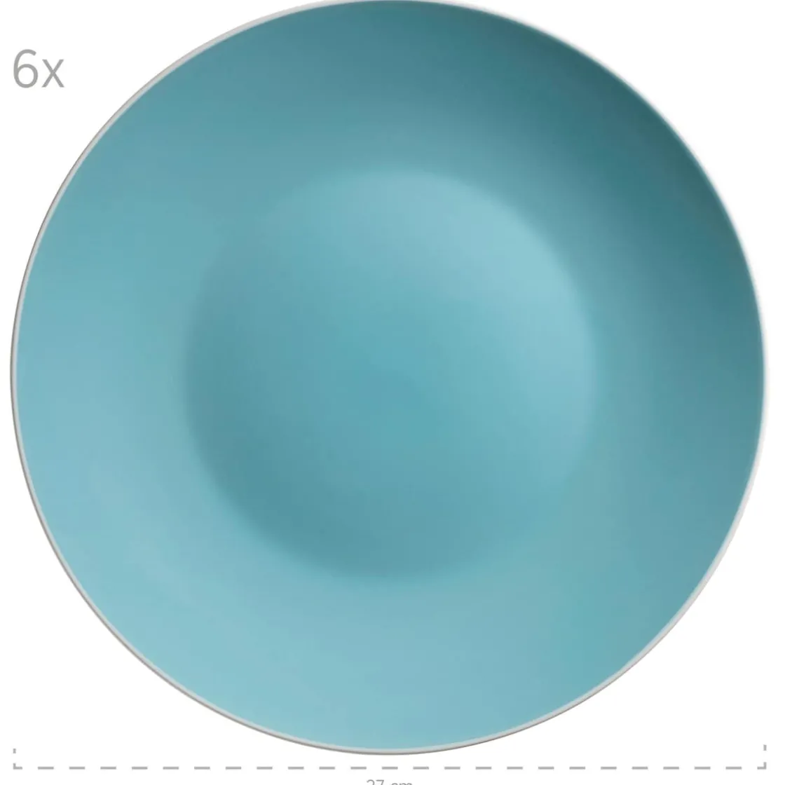 Dieses moderne und freundliche Geschirrset für 6 Personen umfasst 6 flache Speiseteller (Ø 27 cm), 6 Dessertteller (Ø 21 cm), 6 großzügige Müslischalen bzw. Suppenschalen (Ø 18,5 cm, 800 ml Füllmenge) und 6 Kaffeebecher (380 ml)