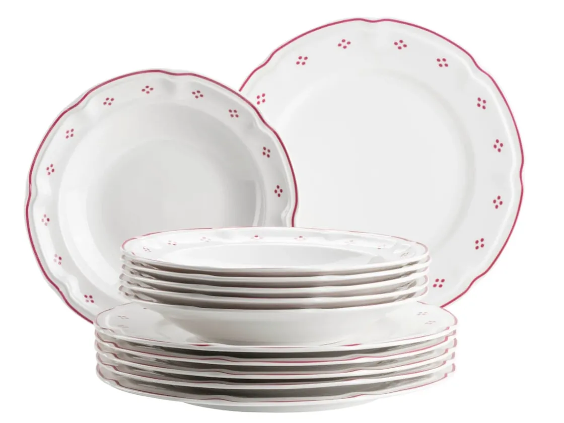 Mit dem Tafelservice „Lova“ von MÄSER holen Sie sich Landhaus-Charme und Kaffeehaus-Romantik direkt auf den Tisch. Das 12-teilige Set besteht aus 6 Speisetellern (26 cm) und 6 Suppentellern (22 cm), gefertigt aus hochwertigem Porzellan.