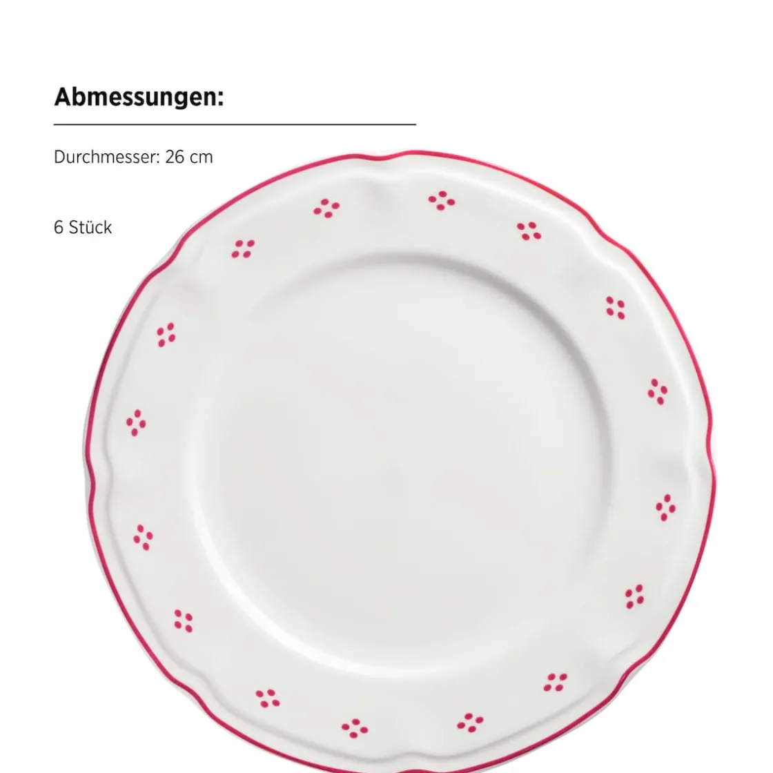 Die Serie überzeugt durch ihr zeitlos weißes Geschirr mit leicht geschwungenen Formen und einem dekorativen Punktmuster. Der farblich passende Rand in Blau und Rot verleiht dem Service einen charmanten, verspielten Charakter.