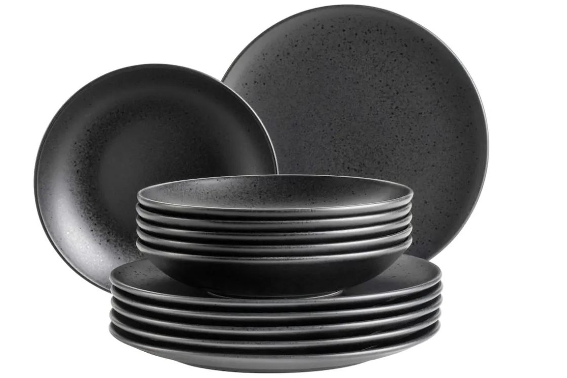 Hochwertiges, modernes Keramik Geschirr made in Portugal: Die Geschirrserie Essential, der Marke Mäser, mit ihrem modernen, runden Coupe Formen ist aus robustem Steinzeug gefertigt. Die dezenten, glänzenden, schwarzen Sprenkel passen perfekt zu der matten, dunklen Glasur. Pflegeleicht, spülmaschinen- und mikrowellengeeignet.