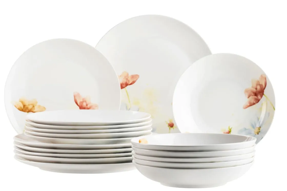 Blumen für den Esstisch – das romantische Tellerset Amapola von MÄSER bringt florale Eleganz und ein Hauch Nostalgie in Ihre Küche. Das 18-teilige Set besteht aus je 6 flachen Tellern (Ø 27,5 cm), tiefen Tellern (Ø 20 cm) und Desserttellern (Ø 23 cm) – perfekt abgestimmt für den gedeckten Tisch von bis zu 6 Personen.