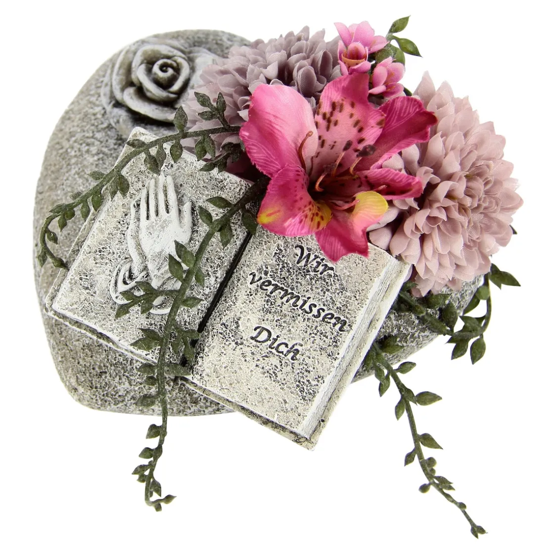 Eine kleine, aber sehr feine Grabdekoration bekommen Sie mit diesen wunderschönen Blumen, die auf einem Herz aus Kunststein mit Gedenkspruch arrangiert sind. Eine schöne Grabdekoration zum Gedenken an Ihre Liebsten!