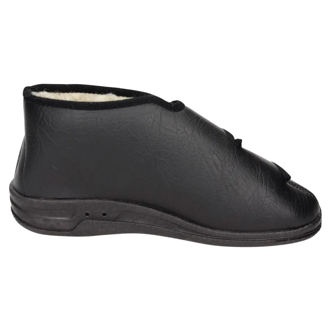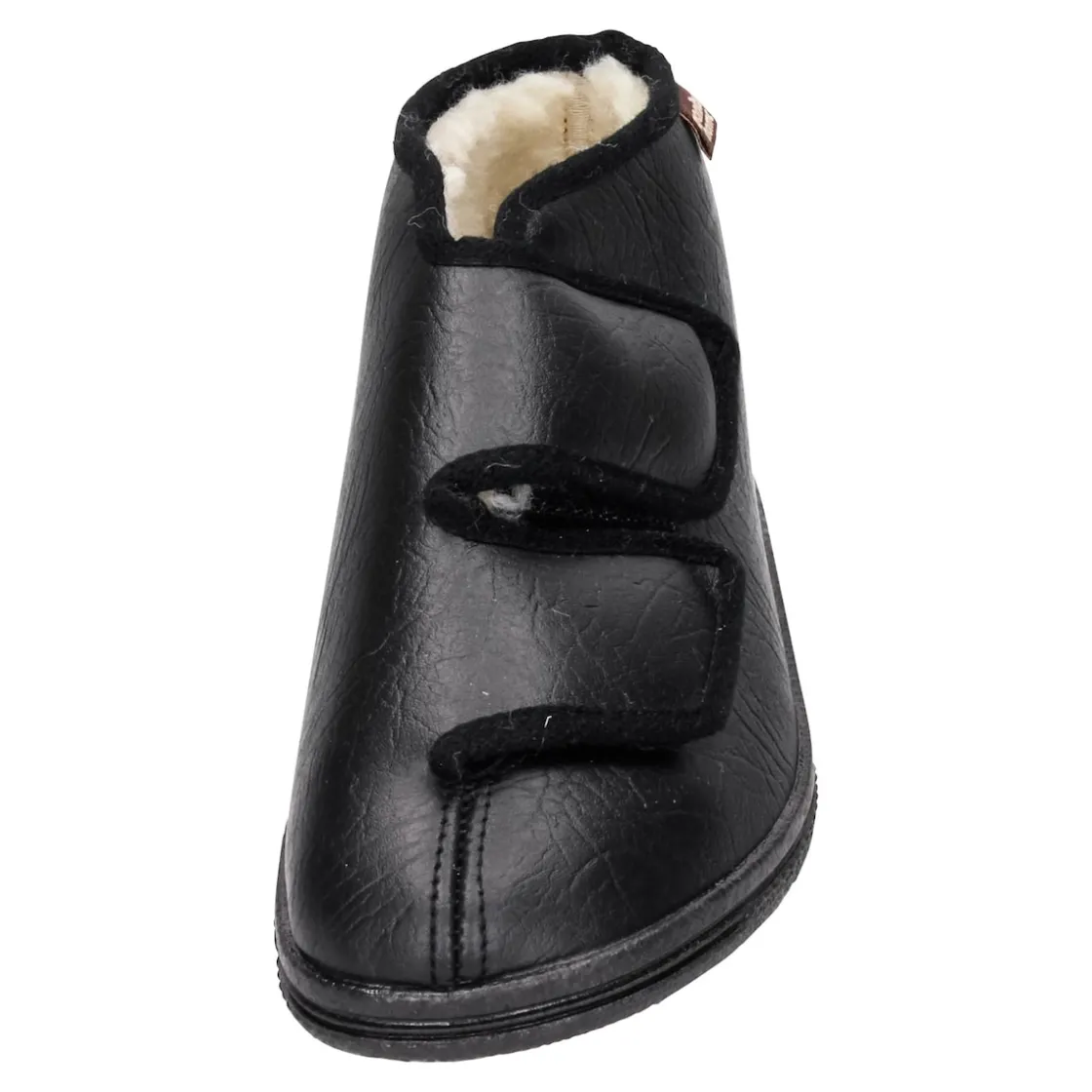 Weit zu öffnen, mit 2 Klettverschlüssen individuell einstellbar. Mit kuscheligem Futter aus Schurwolle. Obermaterial aus Lederimitat, Decksohle aus Schurwolle. Rutschhemmende TR-Laufsohle.