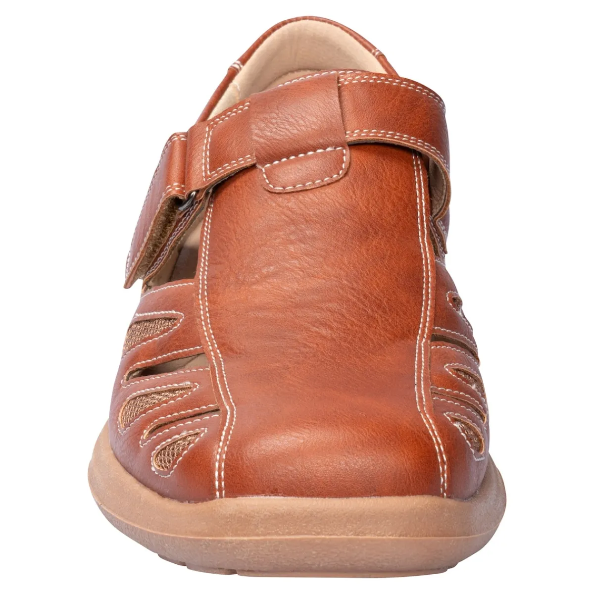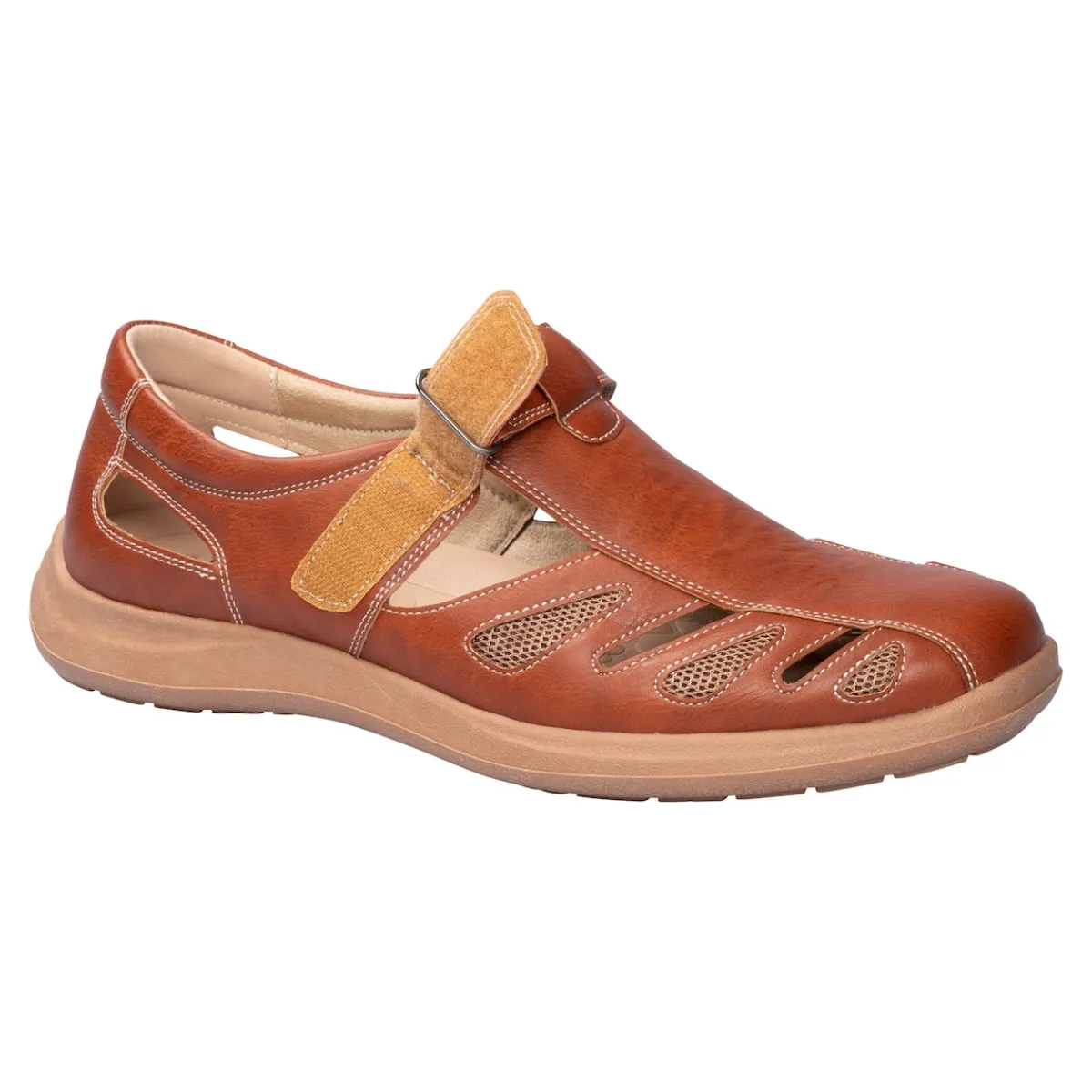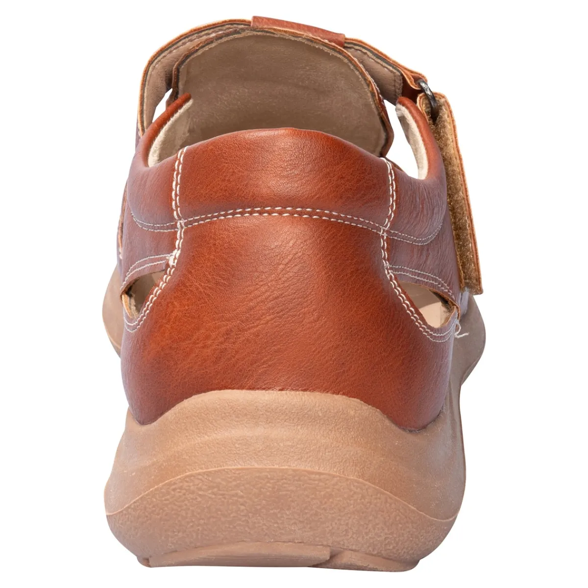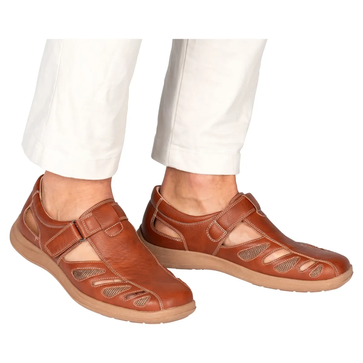Luftig und locker gehen Sie mit dieser Herrensandale in schicker Leder-Optik durch die warme Jahreszeit. Der praktische Klettverschluss garantiert einen sicheren Halt und ermöglicht Ihnen einen leichten Ein- und Ausstieg. Die weiche, herausnehmbare Einlegesohle und die Laufsohle sorgen für ein angenehmes Trage- und Gehgefühl.