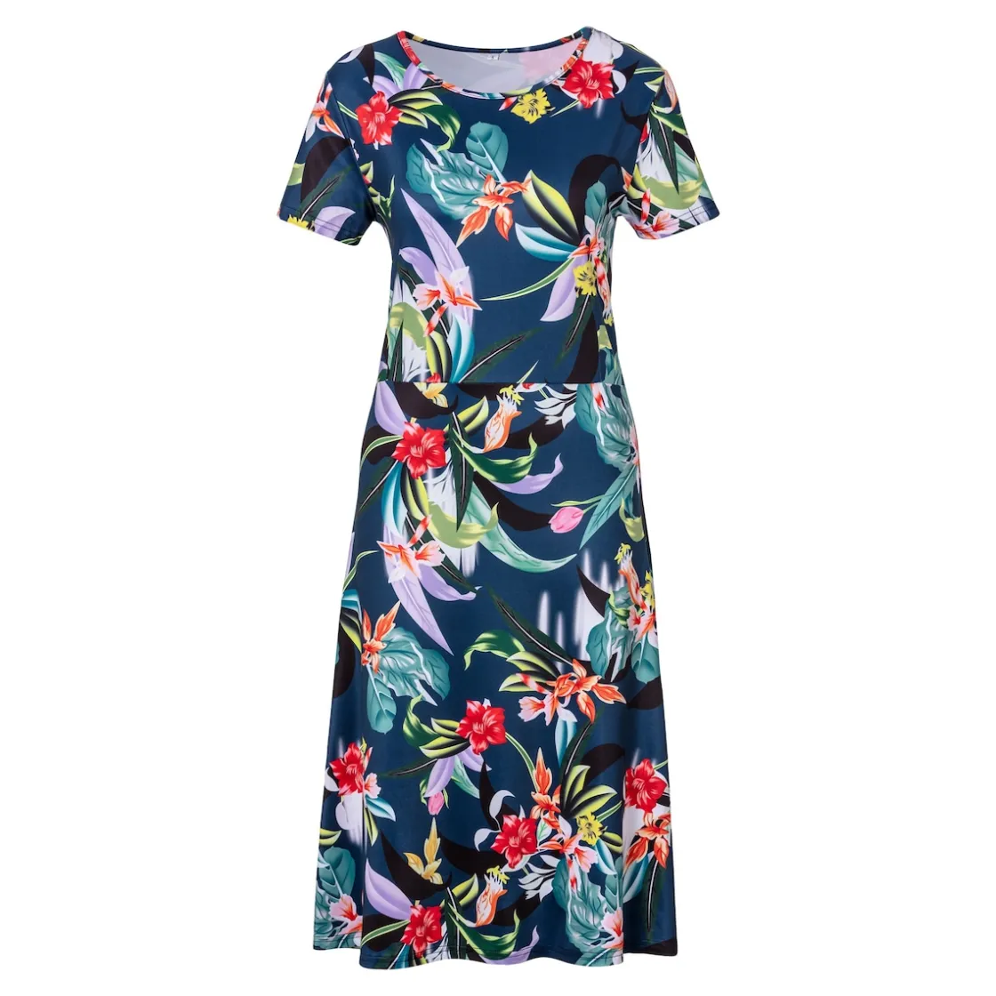 Dieses Blumenkleid versprüht pure Sommerlaune! Sein fließendes Material schmiegt sich sanft an Ihre Figur und sorgt für ein angenehm leichtes Tragegefühl – perfekt für warme Tage. Das farbenfrohe Muster bringt Frische in Ihre Garderobe und macht das Kleid zu einem echten Hingucker. Ob am Strand, in der Stadt oder bei einer Gartenparty – mit diesem Kleid sind Sie stets stilvoll gekleidet!