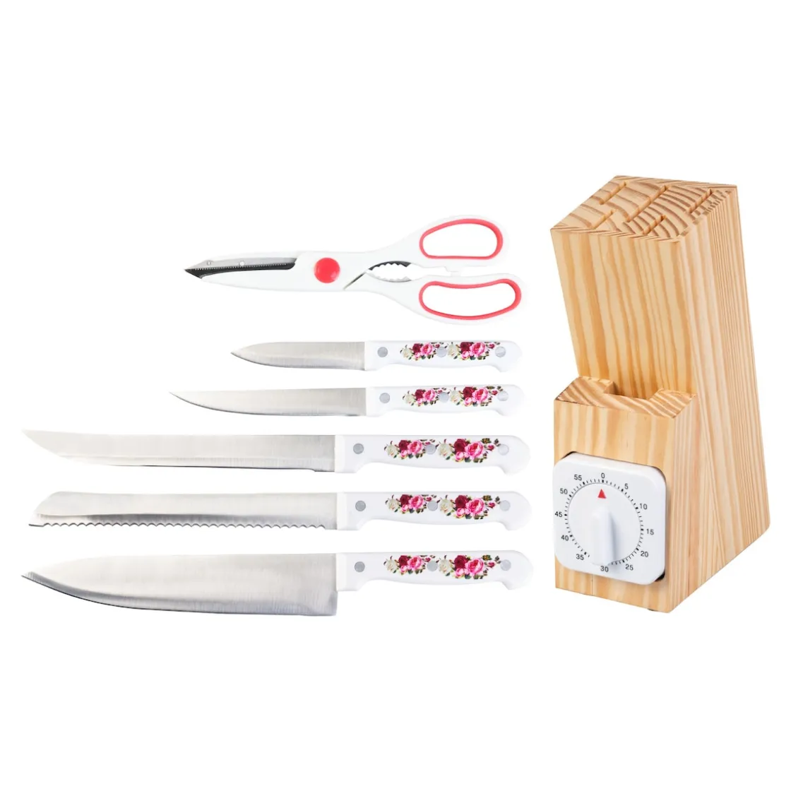 Lassen Sie Ihre Küche in voller Blüte erblühen! Dieses mit Rosen verzierte Messer-Set verbindet stilvolle Eleganz mit höchster Präzision – für Schneidekunst mit Liebe zum Detail. Mit dem perfekt abgestimmten Set aus Koch-, Brot-, Aufschnitt-, Universal- und Schälmesser sowie einer Schere zerkleinern Sie jede Zutat mühelos. Praktisch: Der stilvolle Messerblock mit integriertem 60-Minuten-Timer sorgt nicht nur für Ordnung, sondern auch für perfekte Garzeiten.