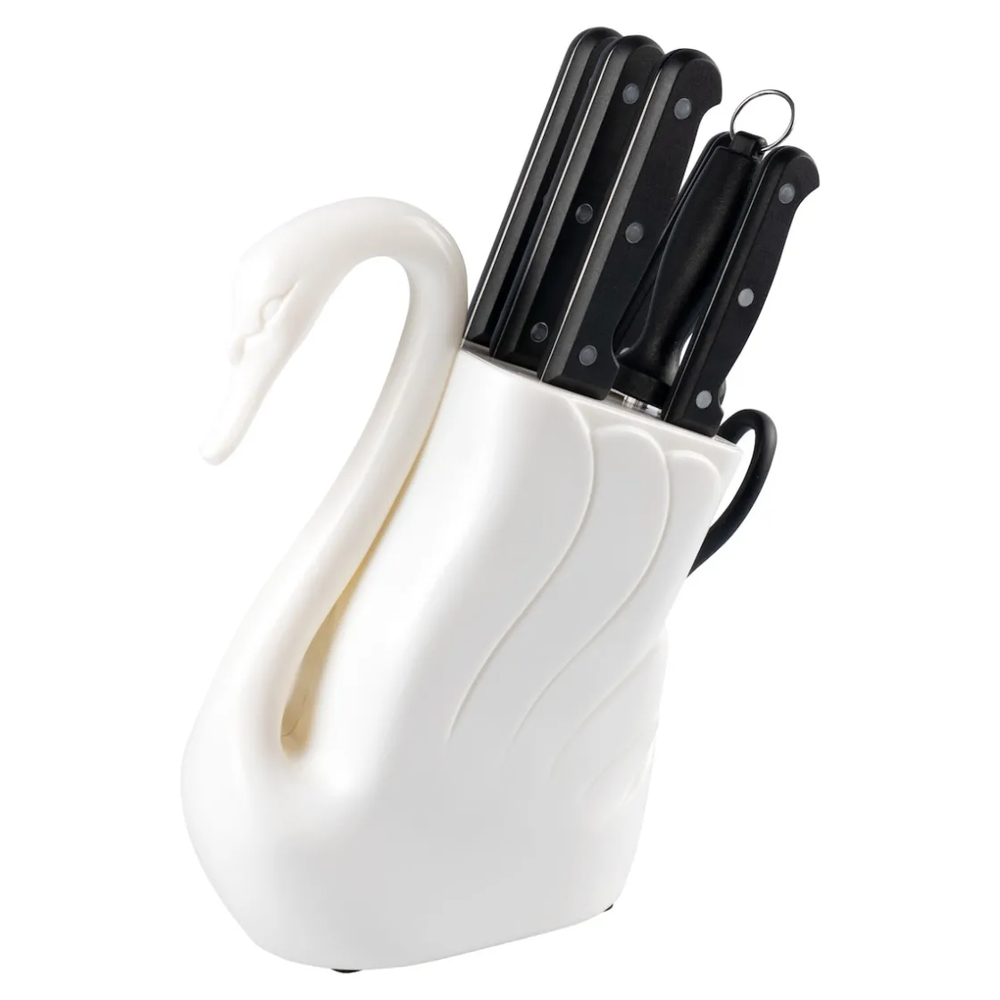 Mit großer Gelassenheit nimmt dieser anmutige Schwan Ihre Schneidwerkzeuge unter seine Fittiche: 5 verschiedene Messer, einen Messerschärfer und eine Schere präsentiert er gekonnt mit majestätischer Eleganz – eine äußerst stilvolle Messerblock-Lösung für jede Küche!