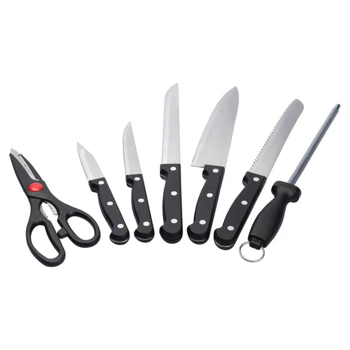 Abmessungen: Kochmesser: (L) 20 cm, Aufschnittmesser: (L) 20 cm, Brotmesser: (L) 20 cm, Universalmesser: (L) 12,5 cm, Gemüsemesser: (L) 9cm, Messerschärfer (ØxL) 0,7×20 cm, Schere: (LxBxH) 22x8x1, Block: (LxBxH) 19x9x27 cm