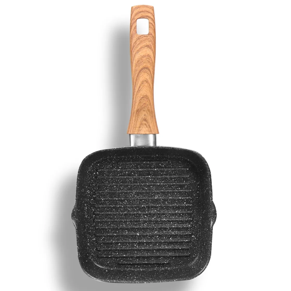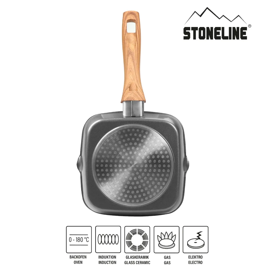STONELINE – Das Original!Gesund fettfrei kochen und braten!Holz ist das angesagte Style-Element, um jedem Küchen-Ambiente einen warmen Akzent zu verleihen und eine beruhigende, ausgeglichene Atmosphäre zu schaffen. Die Back to Nature-Linie von STONELINE vereint diese Eigenschaften. Die Pfannen mit Griff in stilvoller Holzoptik werden selbst auf der gedeckten Tafel zu einem stimmigen Blickfang.Diese 16 cm Grillpfanne ist ein Muss in jeder Küche. Sie ist für kleinere Mengen optimal geeignet. Die gleichmäßige Hitzeverteilung verspricht ein sehr gutes Grillergebnis.Diese Grillpfanne bietet dank ihrer eckigen Form mehr als 30 % Bratfläche im Vergleich zu einer runden 16 cm Bratpfanne!Praktisches Detail: über 2 Ausgusslippen an den Seiten lassen sich Bratensaft oder Bratfett sauber abgießen.Dank der speziellen STONELINE-Antihaftbeschichtung lassen sich Ihre Speisen – je nach Wunsch – mit oder ohne Bratfett und Öl zubereiten und ganz ohne Ankleben aus dem Kochgeschirr lösen.Hierbei spielt es keine Rolle, ob Sie auf Glaskeramik, Induktion, Elektro oder Gas kochen.In Pfannen mit der original STONELINE-Beschichtung bleiben keine hartnäckigen Reste haften und die einfache Handwäsche spart Ihnen Zeit und Mühe.1 Grillpfanne Induktion, ca. 16 x 16 cm, Höhe: ca. 3,3 cm, ca. 0,6 l; Induktionsboden: Ø ca. 11,7 cmDie wichtigsten Vorteile des STONELINE Kochgeschirrs auf einen Blick:Weltweit einzige Antihaftbeschichtung mit echten SteinpartikelnKratzfeste STONELINE-AntihaftbeschichtungVitaminschonend kochen und braten ohne Fett und ÖlOptimales Bratergebnis und kross gebratenes FleischAuch für Vegetarier geeignet: Gemüse bleibt knackig und saftigKein Anbrennen und kein AnklebenSuper leicht zu reinigenExtra starker, verzugsfreier BodenBodenstärke: ca. 4,7 mmFür alle Herdarten geeignet, auch InduktionBackofengeeignet bis 180 °CMaterial: AluminiumgussGanzjähriges Grillvergnügen:Sorgen Sie mit unseren Grillpfannen für eine leckere Abwechslung in Ihre Küche – egal bei welchem Wetter.Die Grillrippen am Pfannenboden zaubern markante Grillstreifen auf Ihre Lebensmittel.überschüssiges Fett und Bratflüssigkeit sammelt sich am Boden der Rillen, während das Bratgut erhöht liegt.Egal ob Steaks, Gemüsestreifen, Fischfilets oder Garnelen, mit dieser Grillpfanne schmeckt es herrlich nach Sommer.Unser Tipp: Steaks nach dem Anbraten noch im Backofen durchziehen lassen oder mit Käse überbacken.Reinigungs- und Pflegetipps:Vor dem ersten Gebrauch empfehlen wir, Ihr Koch- oder Backgeschirr mit etwas Wasser und einem milden Spülmittel gründlich auszuwaschen.Verteilen Sie anschließend mit einem Papierküchentuch einige Tropfen Speiseöl auf der Beschichtung.Bei der weiteren Nutzung können Sie auf den Einsatz von Fett oder Öl verzichten!Dank dem Easy-Clean-Effekt wird die Reinigung per Hand empfohlen. Einfach mit heißem Wasser, Handspülmittel und einem weichen Schwamm auswischen.