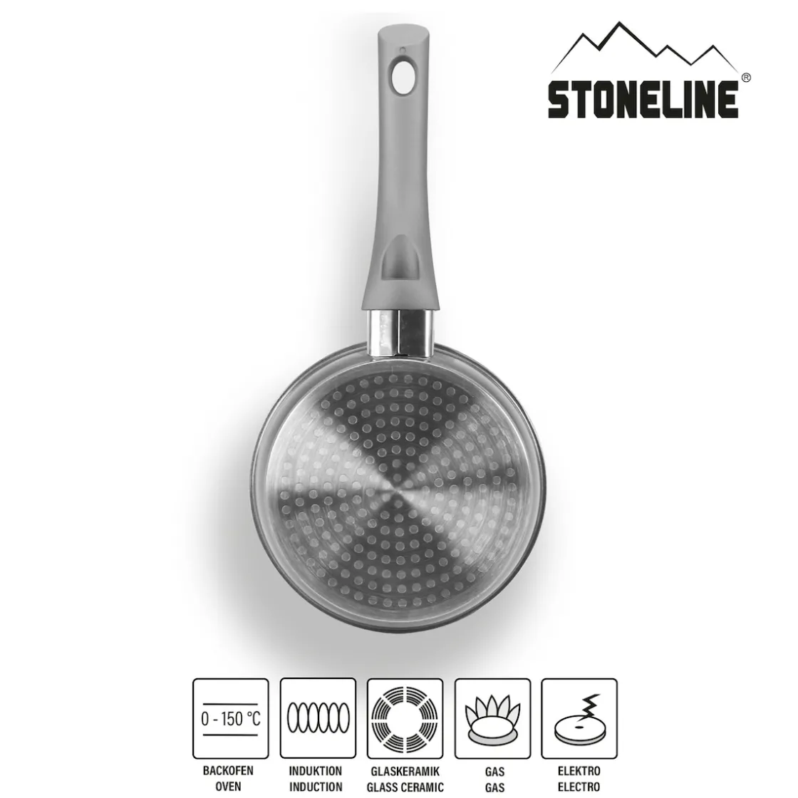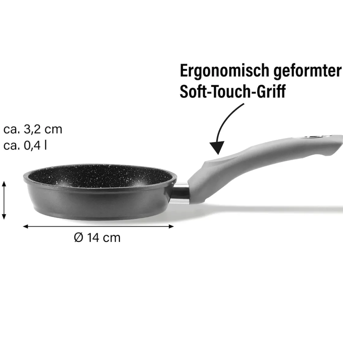 STONELINE – Das Original! Gesund fettfrei kochen und braten! Ein modernes Design in Kombination mit ergonomischen Soft-Touch-Griffen zeichnet die Bratpfannen der STONELINE Gourmundo Linie aus. Diese 14 cm Pfanne ist ein Muss in jeder Küche. Sie ist für sehr kleine Mengen optimal geeignet. Dank der speziellen STONELINE-Antihaftbeschichtung lassen sich Ihre Speisen – je nach Wunsch – mit oder ohne Bratfett und Ol zubereiten und ganz ohne Ankleben aus dem Kochgeschirr lösen. Hierbei spielt es keine Rolle, ob Sie auf Glaskeramik, Induktion, Elektro oder Gas kochen. In Pfannen mit der original STONELINE-Beschichtung bleiben keine hartnäckigen Reste haften und die einfache Handwäsche spart Ihnen Zeit und Mühe. 1 Bratpfanne Induktion, ø ca. 14 cm, Höhe: ca. 3,2 cm, ca. 0,4 l; Induktionsboden: Ø ca. 11,8 cm Die wichtigsten Vorteile des STONELINE Kochgeschirrs auf einen Blick: Weltweit einzige Antihaftbeschichtung mit echten Steinpartikeln Kratzfeste STONELINE-Antihaftbeschichtung Vitaminschonend kochen und braten ohne Fett und Ol Optimales Bratergebnis und kross gebratenes Fleisch Auch für Vegetarier geeignet: Gemüse bleibt knackig und saftig Kein Anbrennen und kein Ankleben Super leicht zu reinigen Extra starker, verzugsfreier Boden Bodenstärke: ca. 4,8 mm Für alle Herdarten geeignet, auch Induktion Backofengeeignet bis 150 °C Material: Aluminiumguss Reinigungs- und Pflegetipps: Vor dem ersten Gebrauch empfehlen wir, Ihr Koch- oder Backgeschirr mit etwas Wasser und einem milden Spülmittel gründlich auszuwaschen. Verteilen Sie anschließend mit einem Papierküchentuch einige Tropfen Speiseöl auf der Beschichtung. Bei der weiteren Nutzung können Sie auf den Einsatz von Fett oder Ol verzichten! Dank dem Easy-Clean-Effekt wird die Reinigung per Hand empfohlen. Einfach mit heißem Wasser, Handspülmittel und einem weichen Schwamm auswischen.